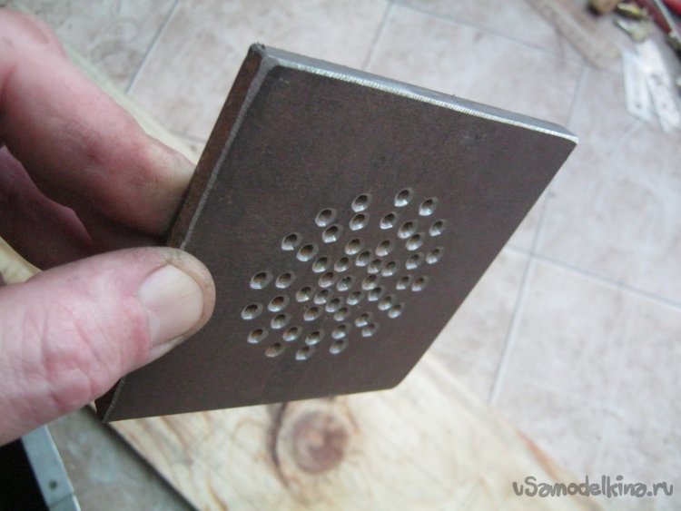 Из нетонкой пластины (Фото 9) выпилил квадратную заготовку, притупил заусенцы, разметил и просверлил ряд отверстий (Фото 10).