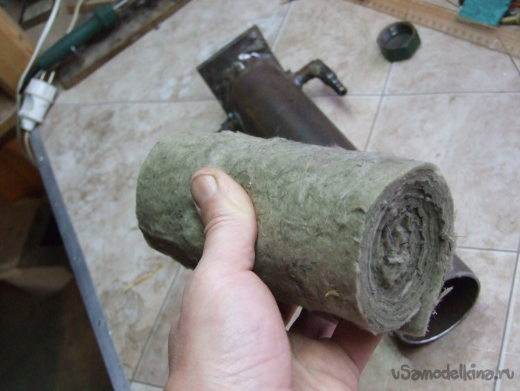В качестве заполнителя фильтра - волокнистого, плотного, влаго- и щелочестойкого, выбрал базальтовый картон. Он тоньше и существенно плотнее ваты. Ровный лист разметил и острым ножом под линейку вырезал несколько полос, свернул их плотным рулончиком (Фото 11), вставил на свое рабочее место (Фото 12). Заполнение базальтовым картоном выбрал примерно на половину высоты фильтра, иначе сильно увеличивается сопротивление потоку газа. Это кстати – продвинув насадку-рулончик повыше донышком лимонадной бутылки, избегнул оплавления базальтовых волокон при дальнейшей сварке. Насадка экспериментальная, при необходимости ее можно вынуть по частям через горловину сверху.