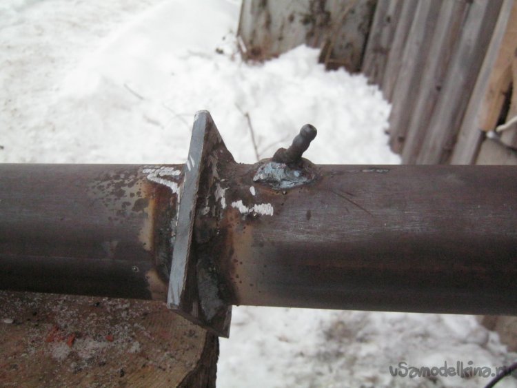 Разметил, просверлил отверстие и вварил короткий прямой штуцер для выхода газов (Фото 7).
