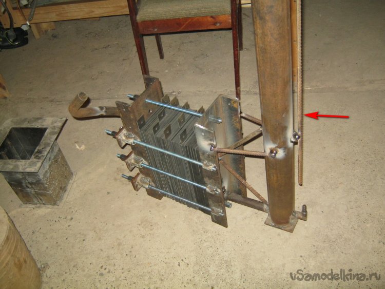 С помощью деревянных прокладок – кубиков и обрезков досочек, приставил колонну к реактору, в нескольких местах закрепил сваркой на «живую нитку». Вырезал по месту и аналогично установил и ряд упоров с раскосами из отрезков арматуры (Фото 15).