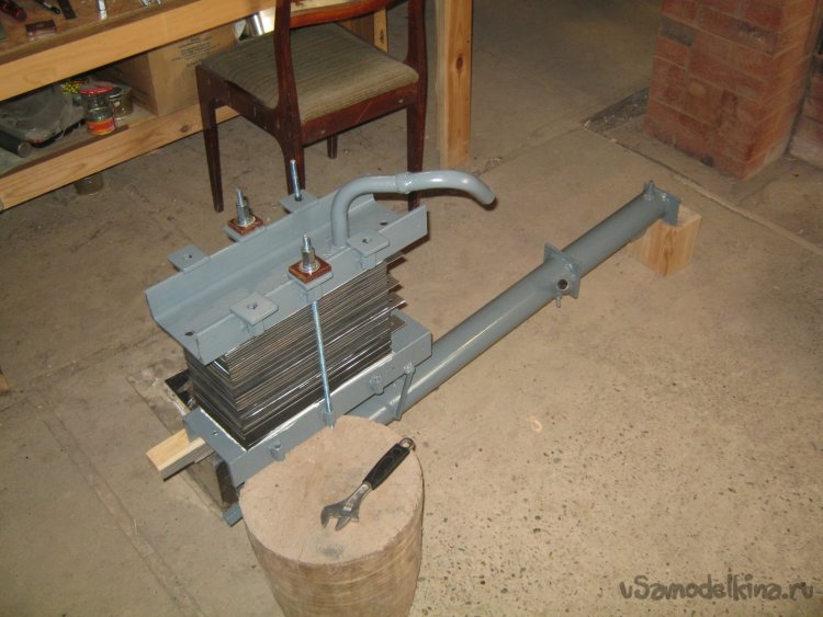 Несколько дней сушки железок на печи, затем покраска. Применил грунт-эмаль по ржавчине. Она дороже обычной ПФ-115, зато плотная, прочная, очень стойкая. Применяю ее в ответственных местах и не по ржавчине. Свои железки почистил наждачной бумагой и проволочной щеткой, продул сжатым воздухом от пыли, покрасил эмалью в два слоя, залепив предварительно рабочую зону (внутри реактора) бумажным скотчем и нетолстым картоном. По зимнему времени сушил в теплой сухой бане и на печи в мастерской (Фото 18).