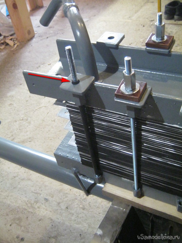 Фото 15. Жесткое скрепление двух аппаратов – реактора и колонны-бака с фильтром. Стрелочкой показана установленная штанга для крепления мягкого прозрачного шланга-уровня.