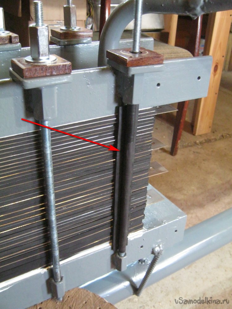 Фото 20. Окончательная сборка реактора. Стрелочкой показана выступающая за металлическую опору изоляция шпилек.
