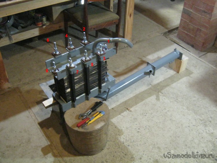 Фото 22. Упорядоченное затягивание позволило с небольшими усилиями, последовательно, по полтора-два оборота каждую гайку, сильно стянуть пакет не калеча резьбы. Лучше всего получилась в порядке – 1-2-3-4-5-6-7-8-1-2-3-4-5-6-7-8… и т. д.