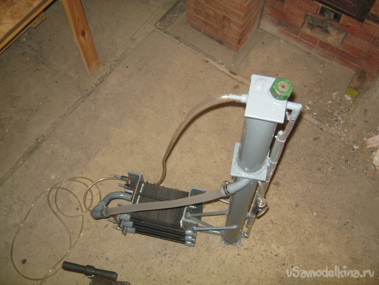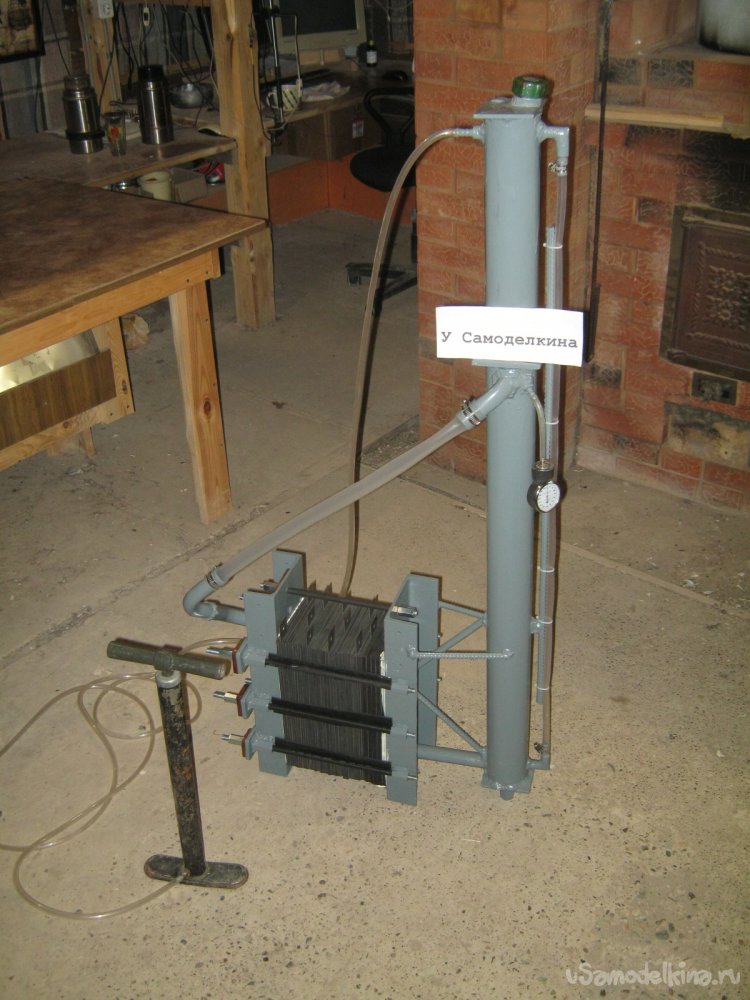 После сварки, колонну с примыкающими железками и заднюю торцевую пластину реактора, с кривым выходным патрубком, проверил на герметичность – заглушил отверстия и накачал ручным насосом до рабочего давления. Об утечках можно было судить по чувствительному манометру от медицинского тонометра присоединенному к одному из патрубков. В связи с неудобством проведения сварочно-болгарочных работ, свищи и поры в сварочных швах заделал эпоксидной смолой – разогрел в теплом месте компоненты, отмерил на весах, тщательно смешал, густо промазал все сварочные швы, одновременно создавая разрежение внутри аппарата. Для этого термоклеем приделал к горловине фильтра обратный клапан от вакуум-камеры для пропитки трансформаторов и воспользовался штатным насосом (Фото 17).