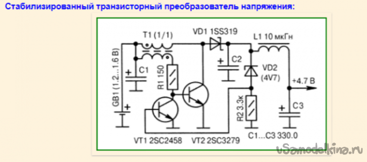Трансформатор мотается сразу двумя жилами, чтобы в каждой обмотке получилось по 12 витков. После чего конец одной обмотки соединяется с началом второй, это и будет средняя точка на которую подается "+" питания. На схеме нарисованы резисторы с другими номиналами из-за того, что входное напряжение в два раза меньше моего и поэтому поставил такие резисторы, чтобы транзисторы не вышли из строя. Если вы будете запитывать от батарейки 1.5В или аккумулятора 1.2В, то их менять не нужно. Только нужно будет заменить стабилитрон, почему именно на 8.2В? Потому что на выходе будет 9.2В, а если установить на 9.1 то на выходе у меня получилось 10.5В.