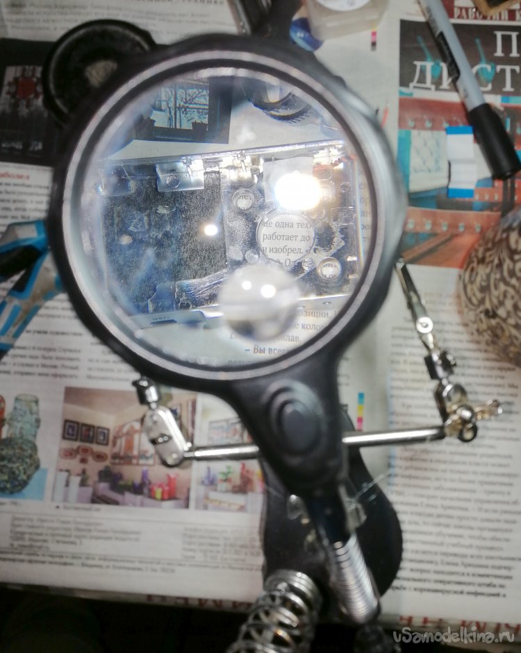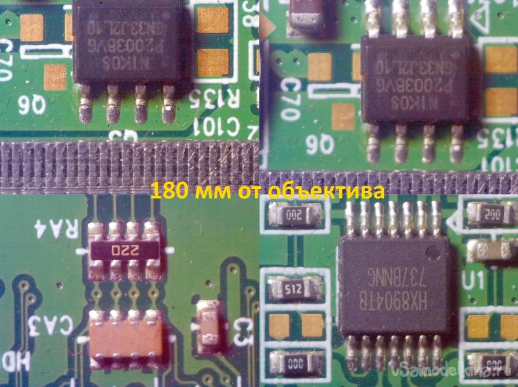 Такой увеличитель - вещь для меня специфическая и потребует времени, чтобы привыкнуть и довести ее до ума. Когда привыкаешь смотреть прямо на объект - первое время трудно согласовать действия рук со зрением, глядя на экранную картинку в другой стороне. Картинкой и увеличением остался доволен, но все же попробую позднее поставить другие объективы. Камера хорошо фокусируется на расстояниях от объекта от 100 до 300мм, достаточное увеличение для работы с паяльником получается при высоте объектива над столом 180-200 мм, чего не обеспечивает ни один китайский «микроскоп» с бюджетом около $50. В общем устройство неплохое и нужное - позволяет работать с любой мелочевкой не загораживая пространство над ней.