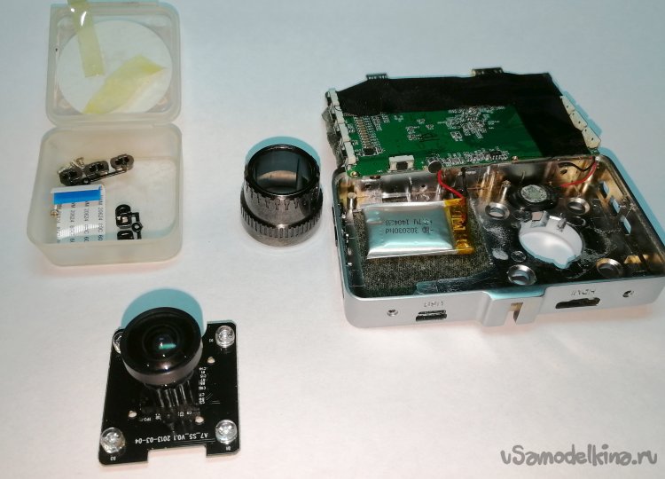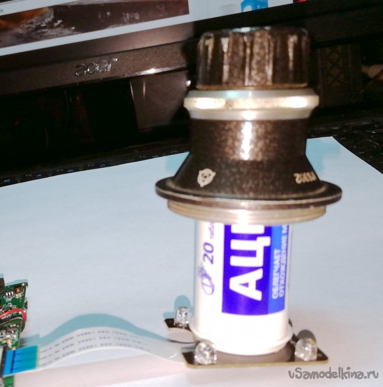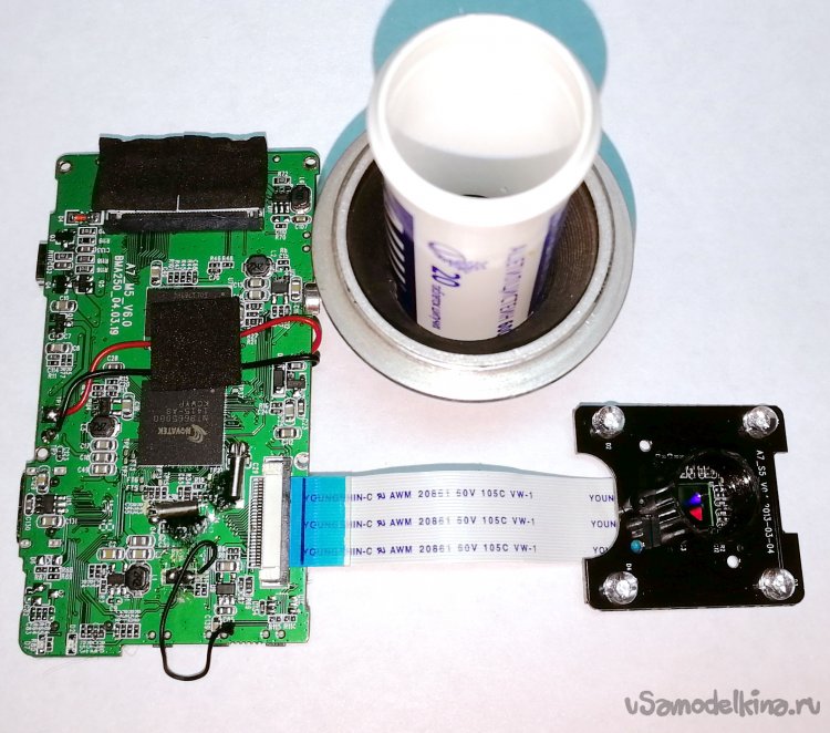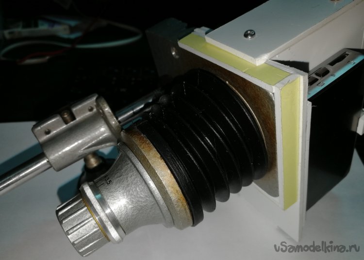Увеличитель сохранился в отличном состоянии, даже резиновая гофра была без трещин и после протирки силиконовой смазкой приобрела хорошую эластичность. Что-либо кардинально переделывать в таком «ретро» совсем не хотелось, поэтому всю новую начинку было решено крепить без изменений в заводской конструкции «Юности». Вся верхняя часть с рамками, линзами и шнуром питания была аккуратно упакована, а механизм фокусировки в дальнейшем послужит площадкой для крепления регистратора и модуля камеры. Фото ниже – модуль на фоне площадки.