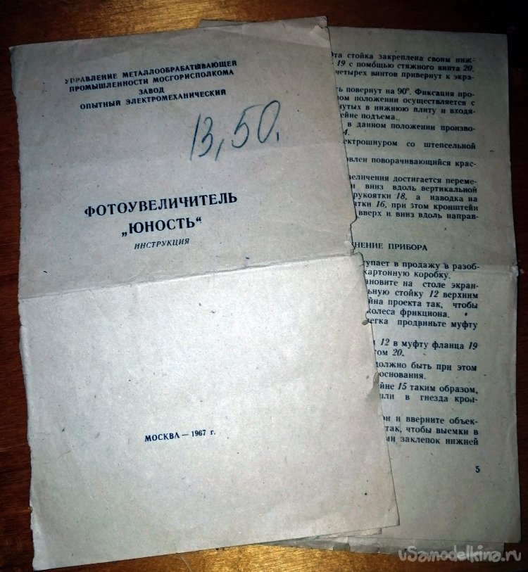 Оставалось определиться с механической частью микроскопа, которая будет отвечать за высоту оптики и ее фокусировку. И тут, просматривая объявления по объективам (с такой же резьбой и фокусом можно купить более «продвинутый» объектив от фотоаппарата) наткнулся на объявление о продаже фотоувеличителя «Юность» 1967 года выпуска. В этот же день забрал за 300р в полном комплекте и плюсом с еще одним объективом Индустар 50У-1 (в комплект с увеличителем он в те времена не входил, зато фотоувеличитель стоил всего 13 руб. 50 коп.)