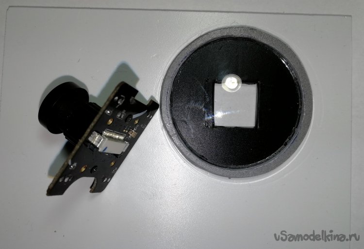 С модуля камеры были убраны выступающие ИК-диоды подсветки, а квадратное отверстие 14х14 мм позволило разместить сенсор с обратной стороны со всей обвязкой, чтобы текстолит модуля камеры мог плотно прилегать к поверхности ПВХ пластины. Главное стараться разместить сенсор строго по центру оптической оси объектива.