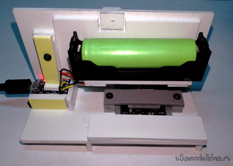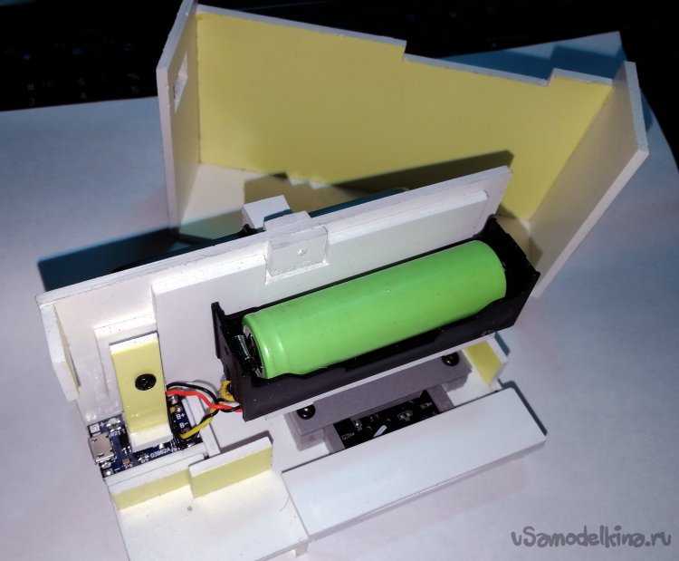 Вся остальная конструкция клеилась так же из листового вспененного ПВХ толщиной 3 мм. Материал отлично режется канцелярским ножом и клеится цианокрилатным клеем типа космофен CA500/200, который широко используется в быту под коммерческими названиями типа «Суперклей», «Секунда» и так далее. Штатный аккумулятор регистратора был заменен на более емкий типоразмера 18650, установленный в отсек-держатель для таких акб. Аккумулятор питает устройство во время работы и одновременно может заряжаться через схему модуля зарядки. Такое решение обусловлено тем, что сигнал с USB разъема регистратора кабелем подается на устройство отображения картинки, и АКБ – единственный способ питать устройство в этом случае. Для удобства видеорегистратор был оставлен в родном корпусе и закреплен в вертикальном положении с фронтальной стороны. Шлейф через отверстие для оптики соединяет регистратор с расположенным горизонтально модулем камеры.