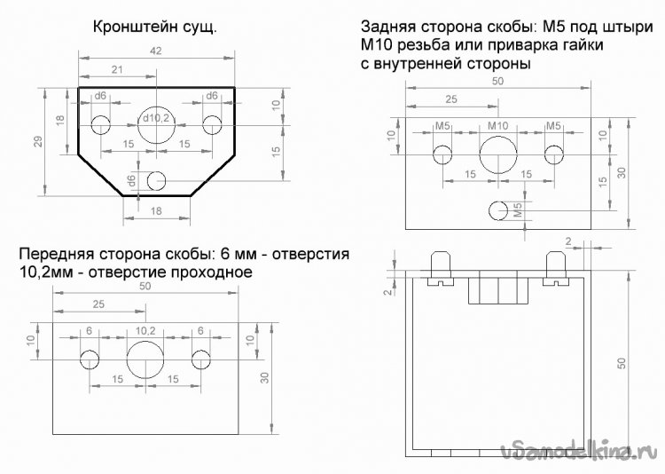 К кронштейну скоба крепится штатным барашком, а площадка к скобе – коротким (10мм) болтом с резьбой М10. С левой стороны скобы так же предусмотрел 3 отверстия, в которых нарезал резьбу М5. Это пригодится для крепления какого-либо съемного оборудования типа подсветки или штанги для небольшого монитора.