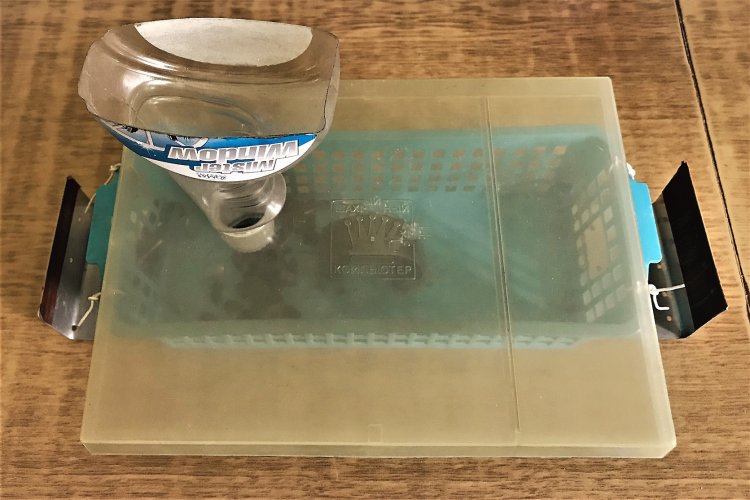 КТС, установленную на металлическом козырьке окна балкона, вы можете посмотреть на рисунке 24. Для неподвижности крепления конструкции в основание первичной (старой) кормушки установлен постоянный магнит. КТС в первый раз на балкон установлена без экрана. Не известно ещё, как отнесутся птицы к такой в общем-то пугающей вертикальной стенке. Поэтому они должны сначала привыкнуть к кормушке.