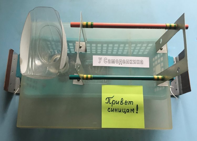 Покритикую немного КТС. Я бы увеличила надёжность работы всей кормушки, использовав не один, а два постоянных магнита для крепления КТС к металлическому козырьку окна. Затем (для большей прочности турника в кормушке) стойки – держатели я бы выполнила из дюраля толщиной 0,75 … 1 мм. А экран для видеосъёмок я бы, наверное, убрала. Не кинопавильон! Да и кинорежиссёра настоящего что-то не видно. Что касается советов «улучшателям» поделок, то я бы порекомендовала установить на кормушку подпружиненную жёрдочку как сделано в ПКС6. Синица садится на жёрдочку. К жёрдочке прикреплён постоянный магнит, геркон срабатывает и … кто заинтересовался, жмите сюда.