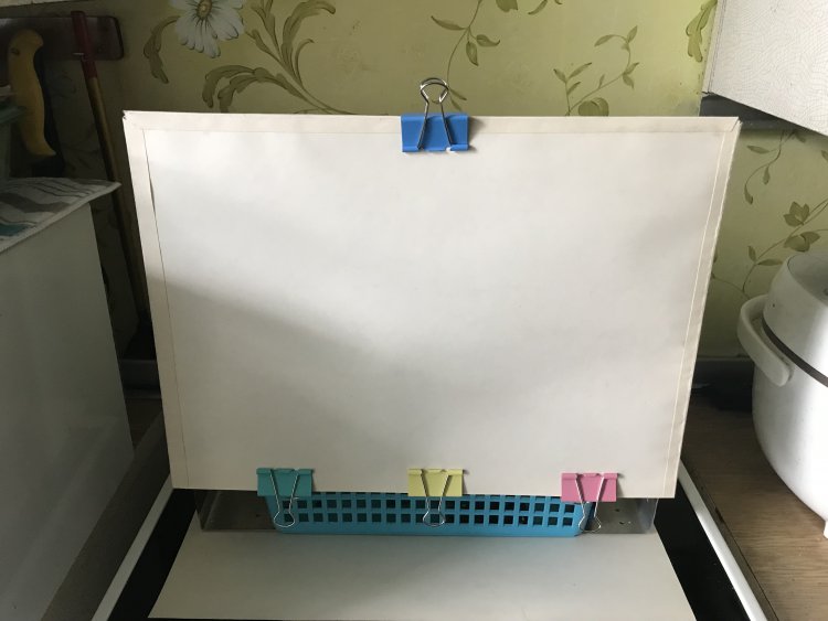 Если у Вас есть желание иногда фотографировать или снимать на видео происходящее на кормушке, то рекомендуется сделать белый фоновый экран. Кинематографическую белую простыню перед кормушкой для птиц повесить вряд ли удастся, поэтому можно обойтись отрезком листового пластика размером, например 380 х 270 мм, одетого в бумажный склеенный конверт (см. рисунок 17). Экран из поделочного пластика пластика легко удерживается в вертикальном положении цветными зажимами для бумаг. Зажимов может быть от 1 до 3 штук. Зажимы фирмы «OfficeSpace» производства КНР, изображённые на рисунке 17 имеют ширину 41 мм и артикул BCLC41_19362. Очень удобные и сильные зажимы для многих случаев!