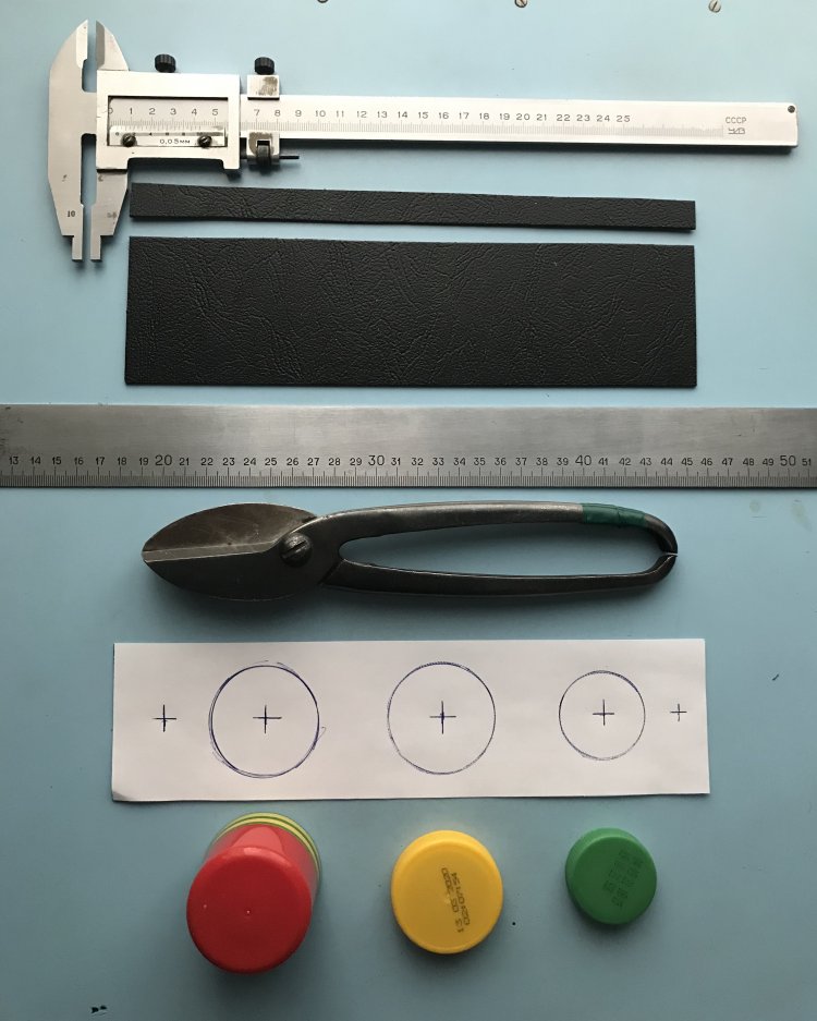 Если у вас есть желание вместо одинарных плошек для корма изготовить легко снимаемую панель для трёх плошек, то переходим к рисунку 19. Здесь мы видим чёрное пластиковое основание панели, размеченное штангенциркулем и вырезанное ножницами по металлу. Разметку центров отверстий на панели выполняем при помощи предварительно изготовленного бумажного шаблона.
