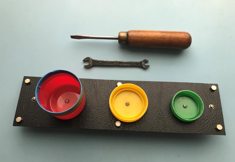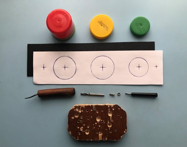 Наложив бумажный шаблон на чёрную пластиковую панель, шилом намечаем центры пяти отверстий и сверлим их сверлом диаметром 3,0 … 3,3 мм. Таким же сверлом просверливаем отверстия в центрах трёх разноцветных плошек (см. рисунок 20).