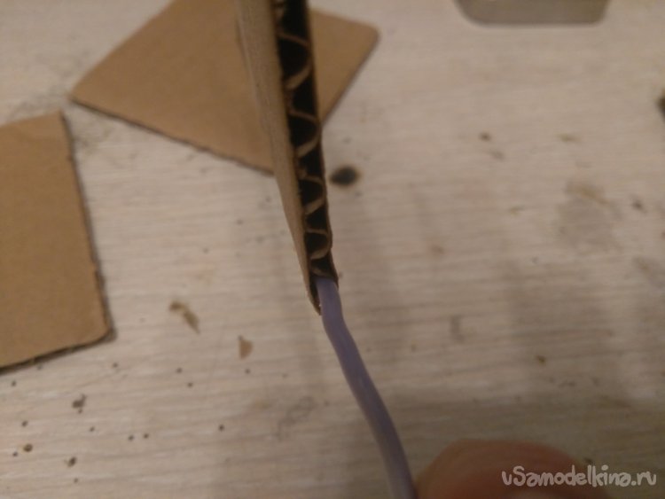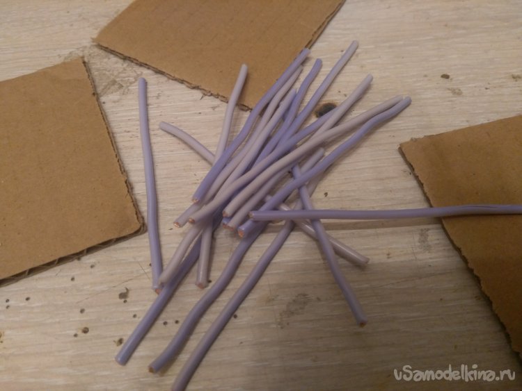 В картоне от коробок есть отверстия, и в них идеально входили одножильные провода. Нарезаем ровно столько, сколько нужно для полного их заполнения.