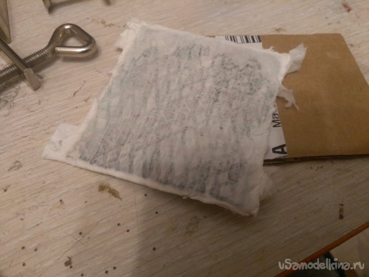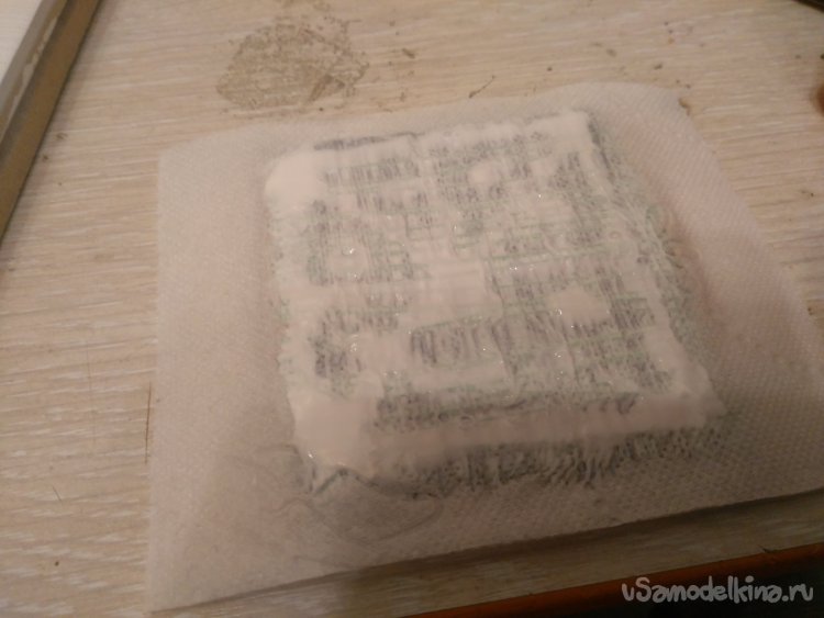 Добавляем клея как можно больше и добавляем наш композитный слой. После окончательного определения его позиции на основе подгибаем оставшиеся висящие края бумаги, пропитав их всё тем же пресловутым клеем.