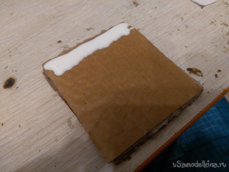 Приклеиваем одну из оставшихся двух картонных заготовок и тут же промазываем и её.