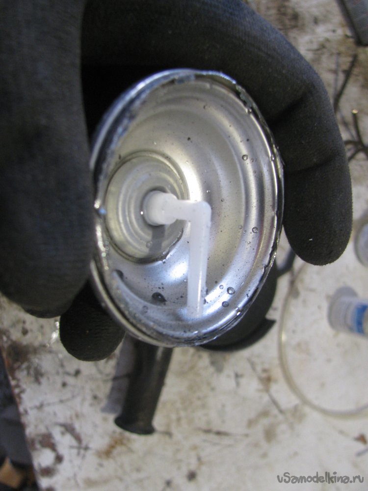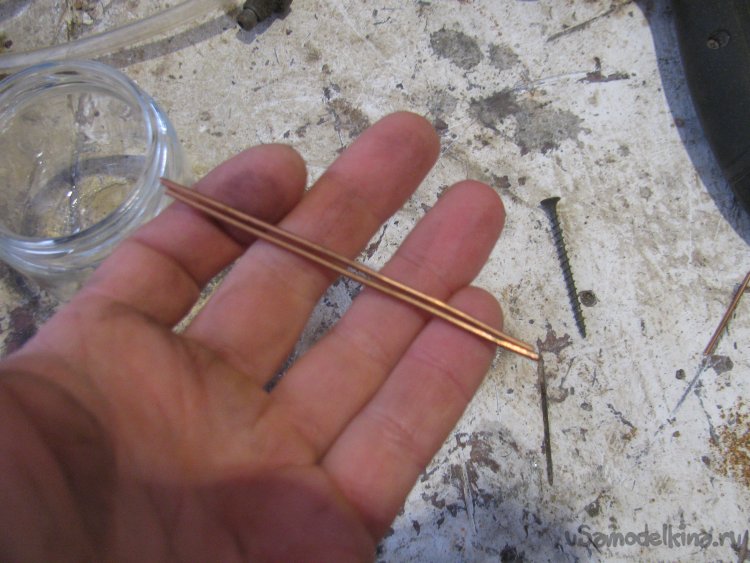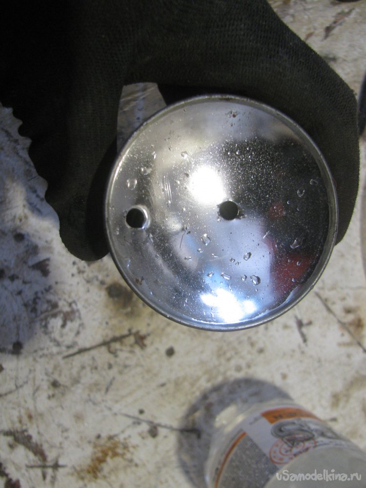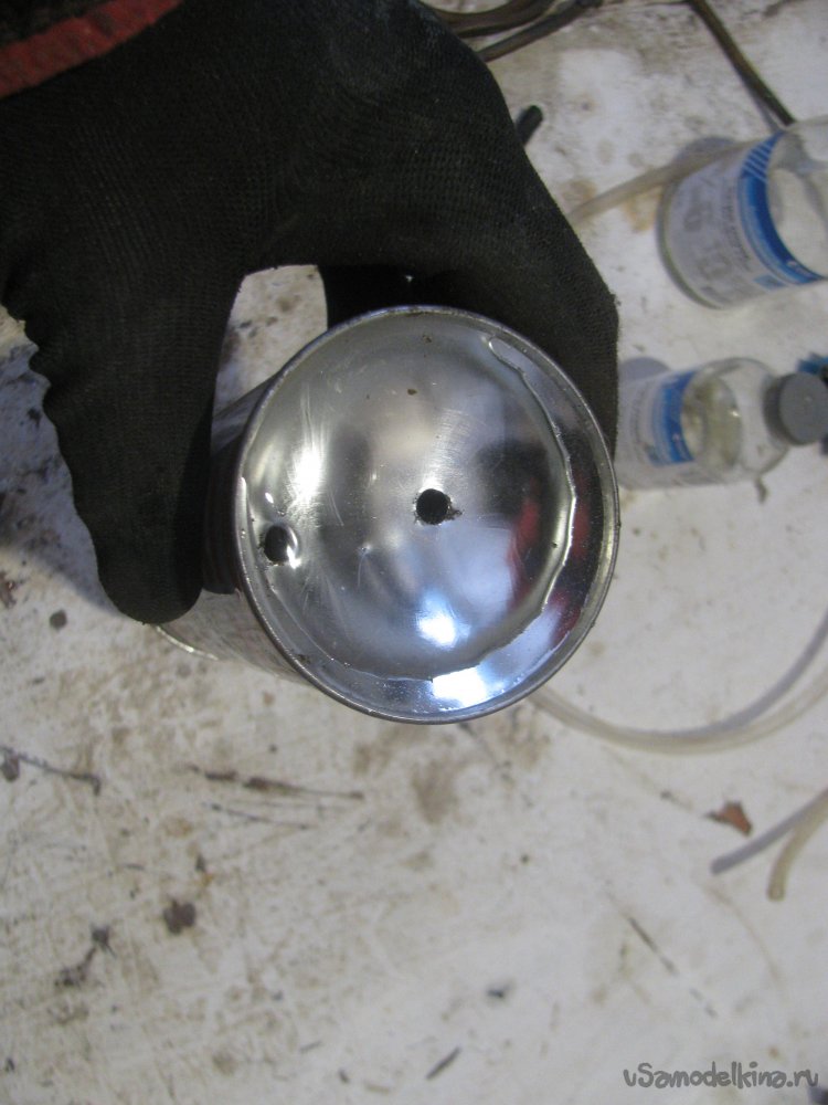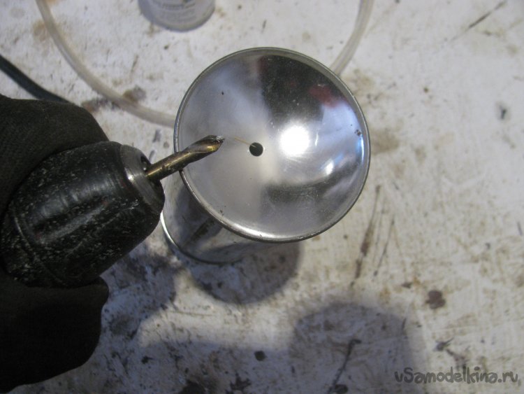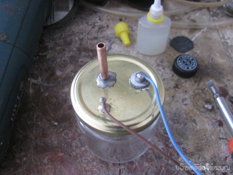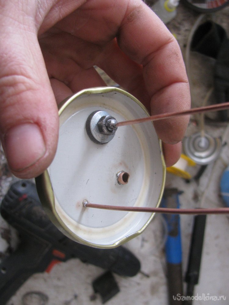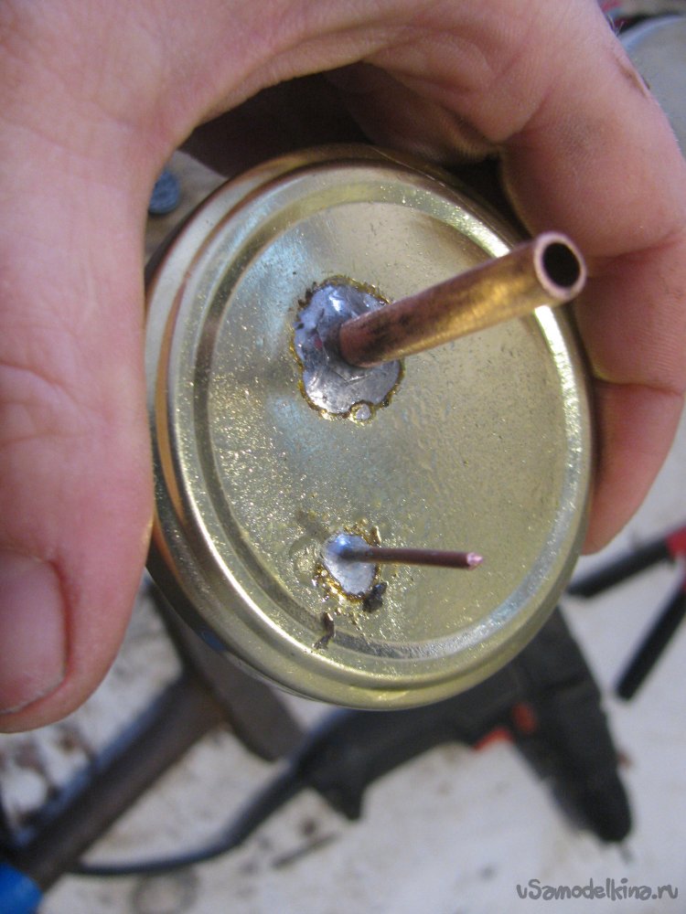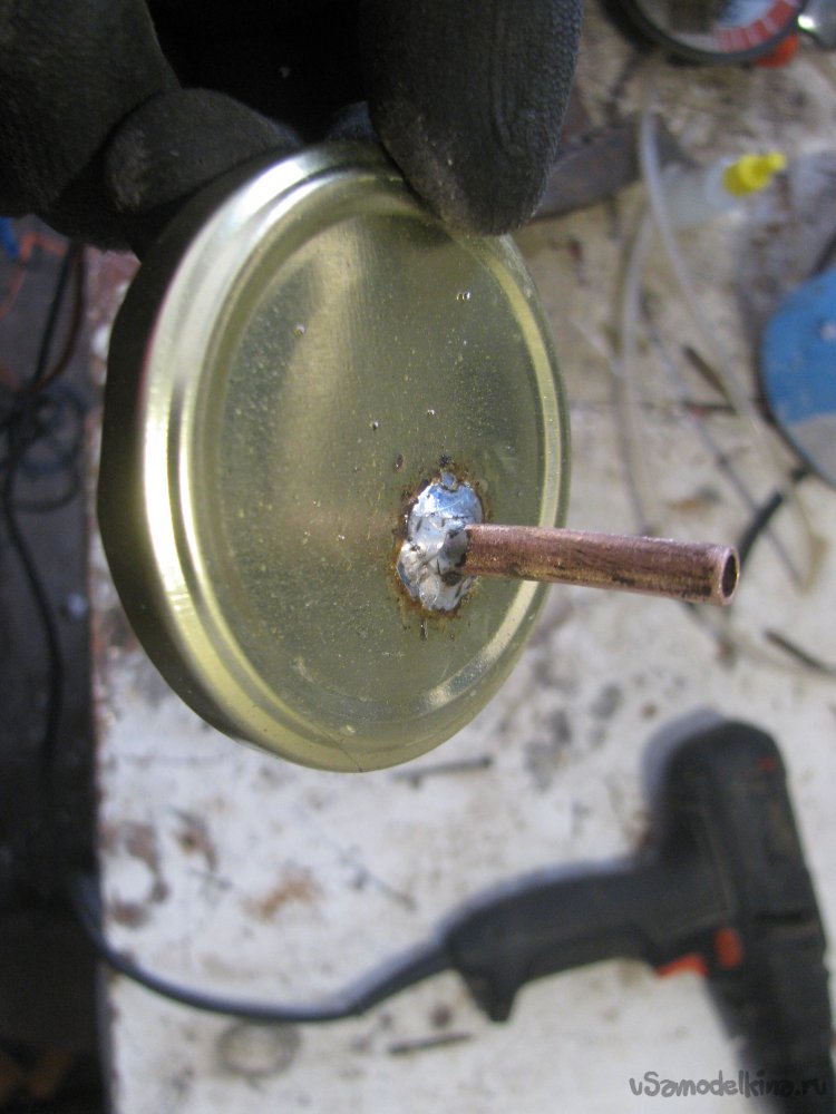 В крышке сверлим отверстие и припаиваем медную трубочку, это будет выходной патрубок для газа.