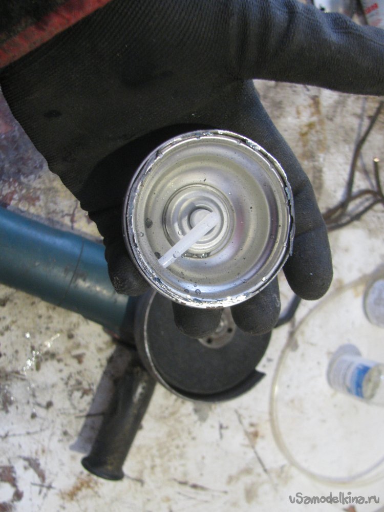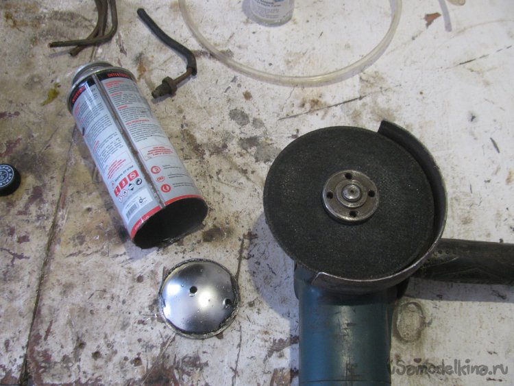 Берем пустой газовый баллончик, не спеша сверлим отверстия в основании. Далее заливаем в баллончик воду, а заем можно сделать первый пропил болгаркой. После пропила, я слил воду и окончательно отрезал лишнюю часть баллона.