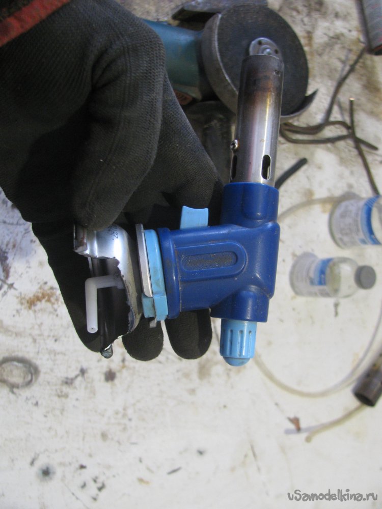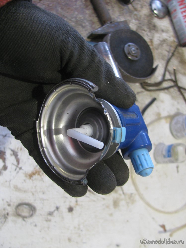 В верхней части уже есть готовая трубочка, отлично, значит, припаивать ничего не понадобится! Просто ищем трубочку такого диаметра, чтобы можно было надеть на этот штуцер. Вот и все, имеем отличный переходник, на который можно ставить разные газовые горелки.