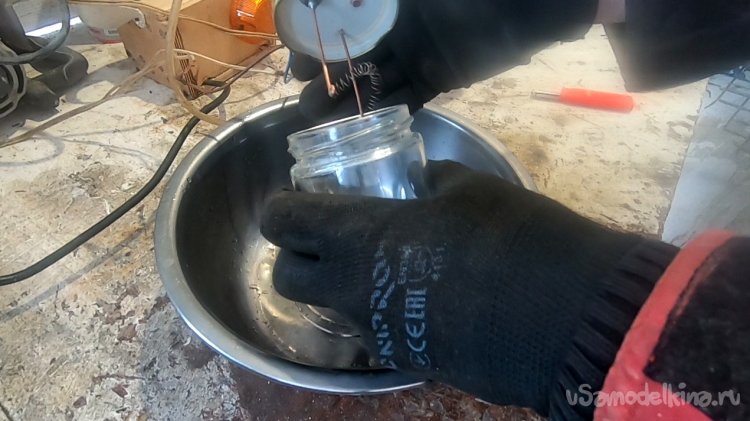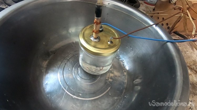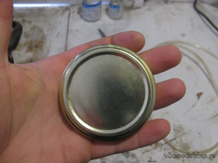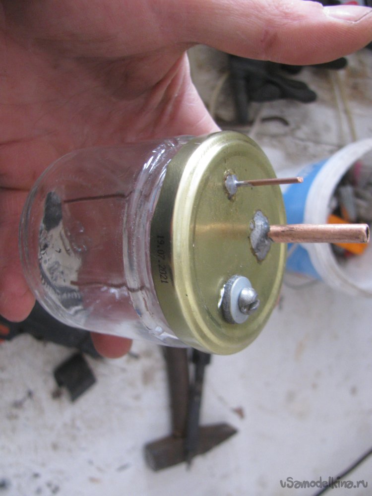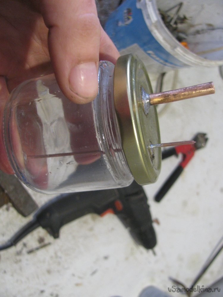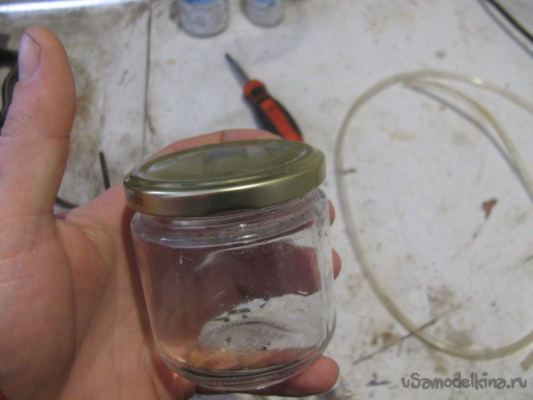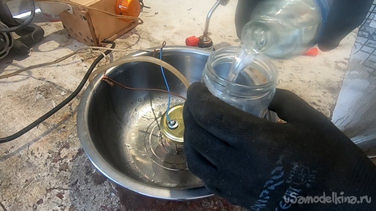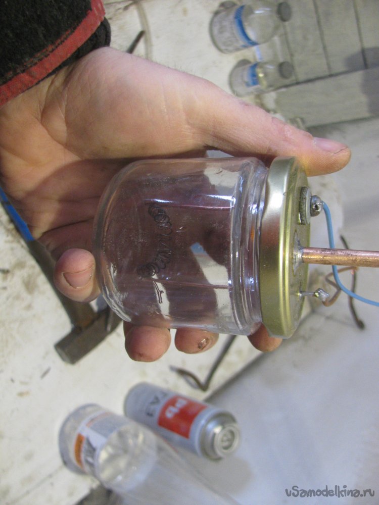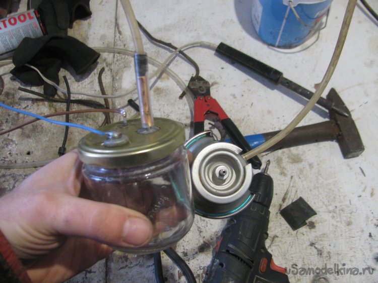 Корпусом газогенератора послужила стеклянная баночка, тут есть большая удобная крышка, на которой можно закрепить генератор. Также плюс в том, что видно как выделяется газ, ну а недостаток – вероятный тепловой раскол, так что тут нужно быть очень аккуратным, тестирование я проводил в металлической миске, чтобы бензин не потек по столу в случае чего.