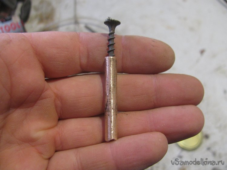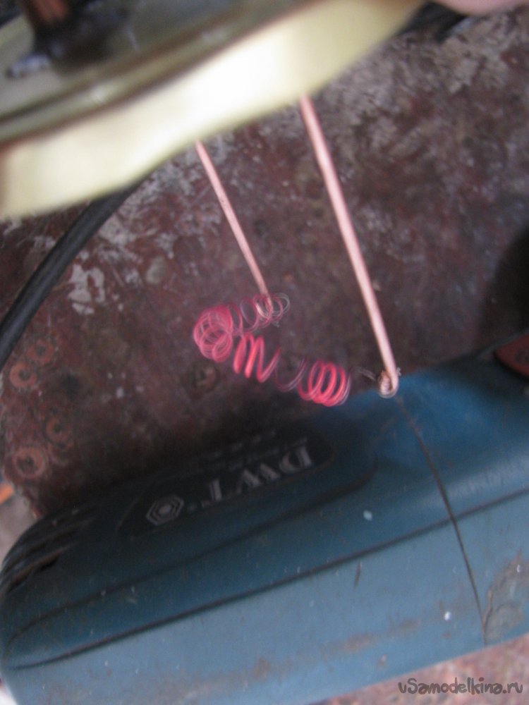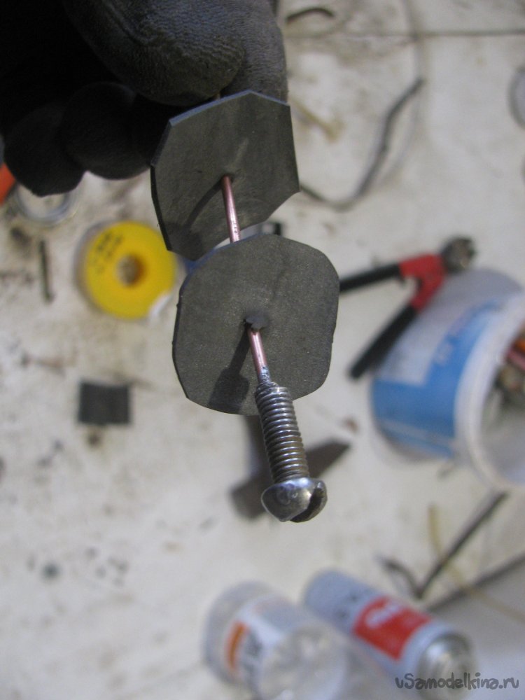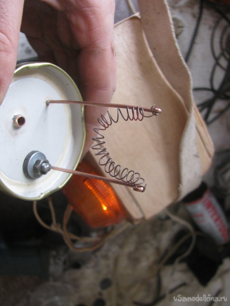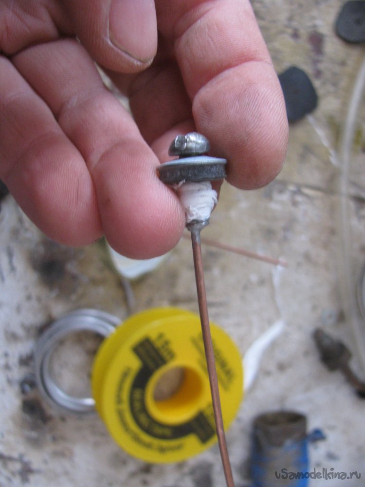 Для крепления спирали взял два куска медной проволоки, одну проволочку припаиваем к крышке, а вторую нужно подключить через изолированный винт, чтобы не было короткого замыкания. Хотел использовать резинки, но тут под руку попались отличные шайбы с резинками, а винт можно обмотать изолентой.