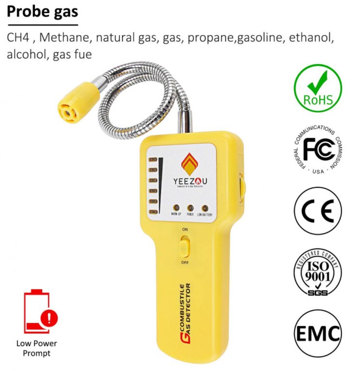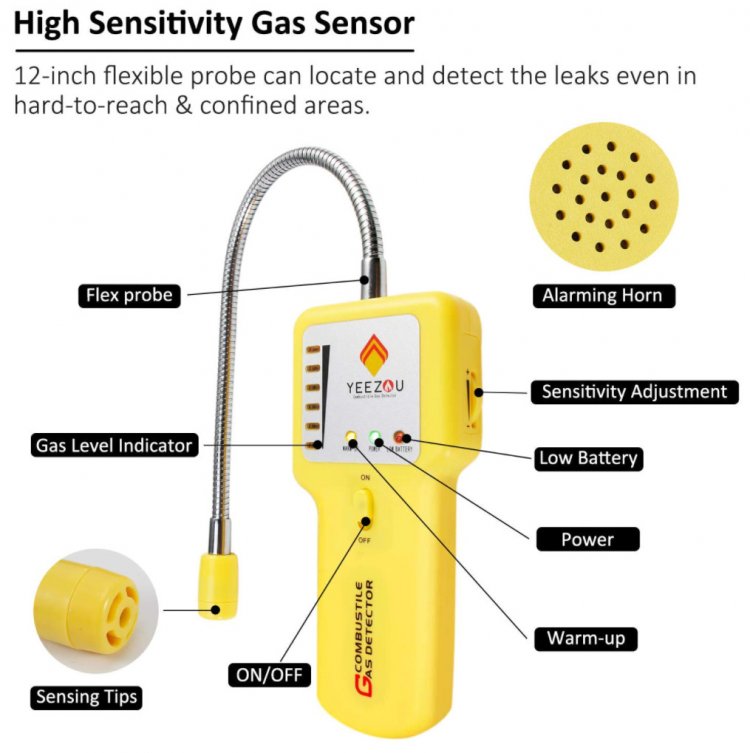 Простой в использовании детектор утечки газа: питание от 3 батареек AAA (не входят в комплект), имеет 12 дюймовый гибкий шланг «гусиная шея», и может найти и обнаружить утечку газа даже в труднодоступных местах дома и на приусадебном участке, кухне, в камине и т. д., смотрите видео «Как и где использовать Y201 детектор горючего газа» на сайте магазина.