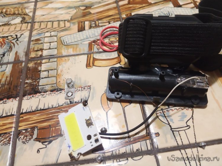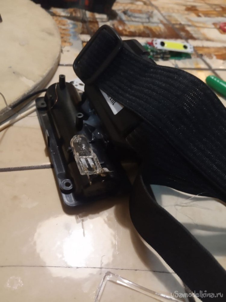 6. Пробуем. Горит ярко, греется, поэтому в эту схему просится резистор. Конечно же, его нет под рукой, на помощь приходит маленькая запасная 12-вольтовая лампочка с антресоли, цена рублей 20-30 (из маленьких кухонных светильников). Хорошо, что она дома оказалась! Впаиваем её последовательно с нашим будущим налобным прожектором. Проверяем, отлично светит! Лампа не светится, она работает просто резистором, падения напряжения на ней хватает для нормальной работы устройства.