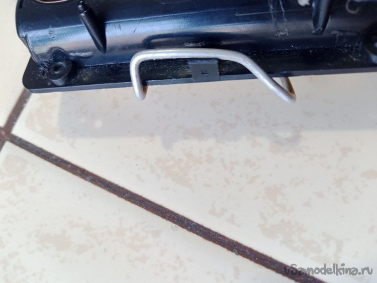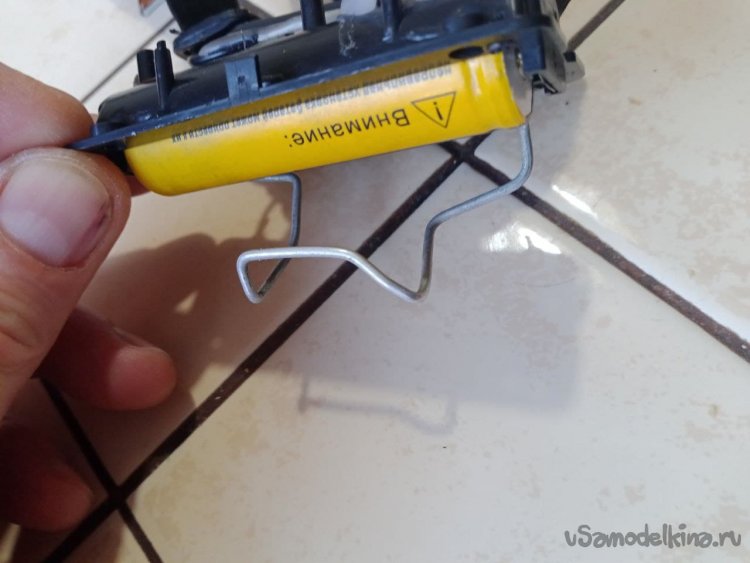 9. Крышка батарейного отсека отсутствует, после недельного тестирования стало понятно, что просто пружины питания держат плохо, иногда батарейка выпадает. Поэтому принято решение сделать что-нибудь простецкое из подручных материалов, чтобы и АКБ не выпадал, и была возможность быстрой замены. Стальная проволока, бокорезы и смекалка нам в помощь. Получилась чудо-скоба, работает на пять баллов.