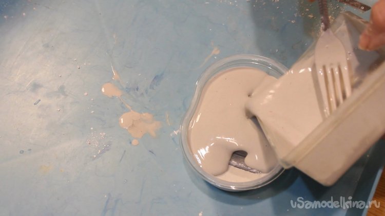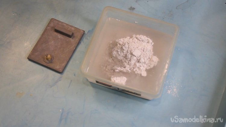Формовочной смесью послужил гипс г16, в предыдущих работах я использовал часто алебастр, но чем меньше детали, тем качественней гипс я приходится брать. Для крепости в гипс можно опционально добавлять песок, дробленый шамотный кирпич или шамотную глину, но для мелких работах его придётся тщательно измельчать и просеивать, но этому я использовал просто гипс.
