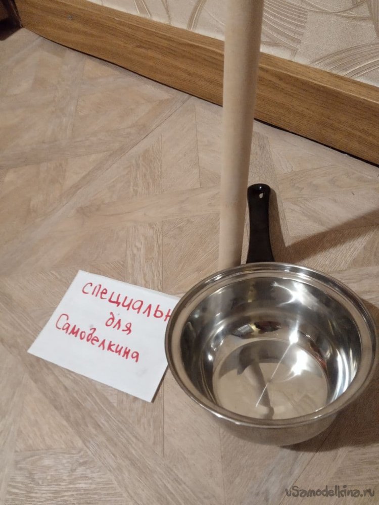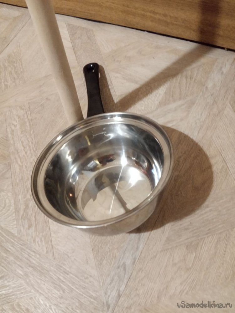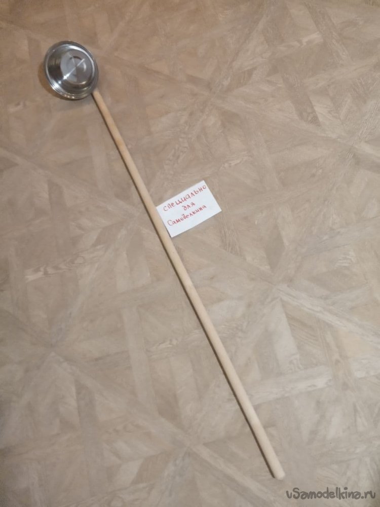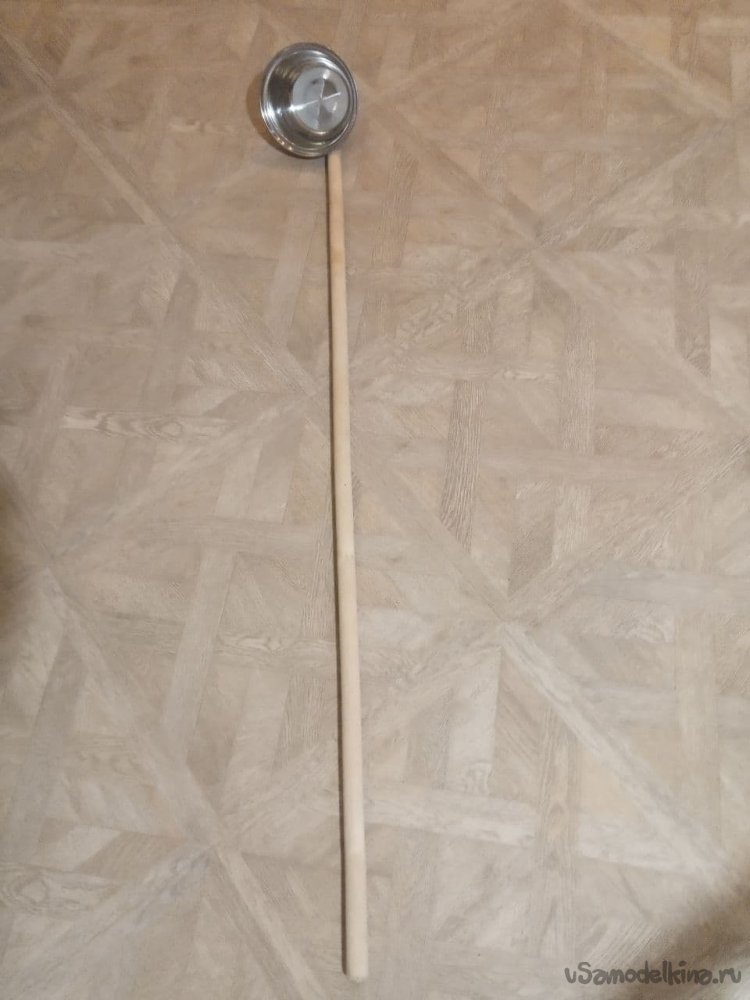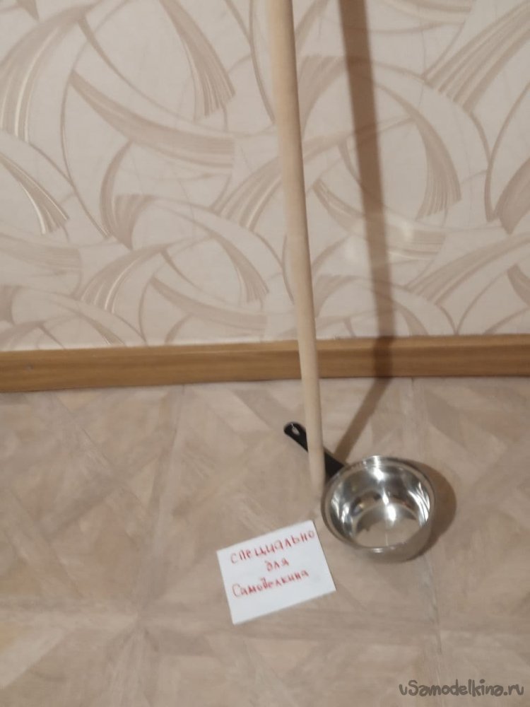 Сколько я живу, столько эта процедура делалась всегда небольшими устройствами, ёмкость с деревянной ручкой длиной около полуметра. Деревянная ручка, само собой, обязательна, ибо металлическая нагреется, и взяться за неё будет жёстко для пользователя. Всегда меня всё устраивало, пока я не увидел устройство от Виталия. Ёпть, всё великое просто, как оказалось! Всегда во всех банях кто-то должен слезть с полки, взять ковшик, черпануть водички и плеснуть её на камни. Оказывается, процедуру можно упростить. Если ковшику сделать длинную ручку, можно и не слезать. Обидно, что не я это придумал. Итак, делаем просто Ковшик с длинной ручкой. Как обычно, исследуем тему и придумываем самый малозатратный вариант из того, что есть под рукой, и вдобавок минимизируем усилия по производству Изделия.