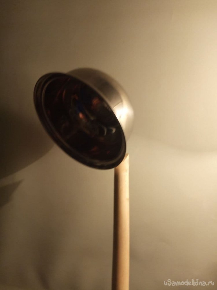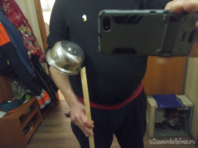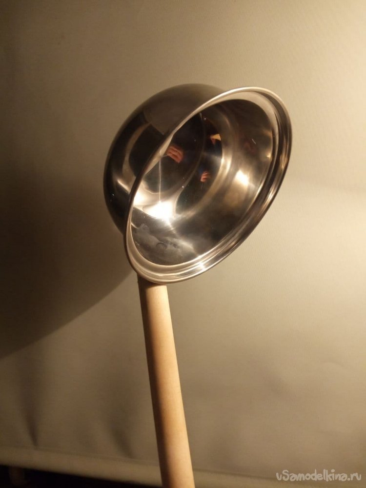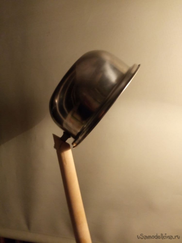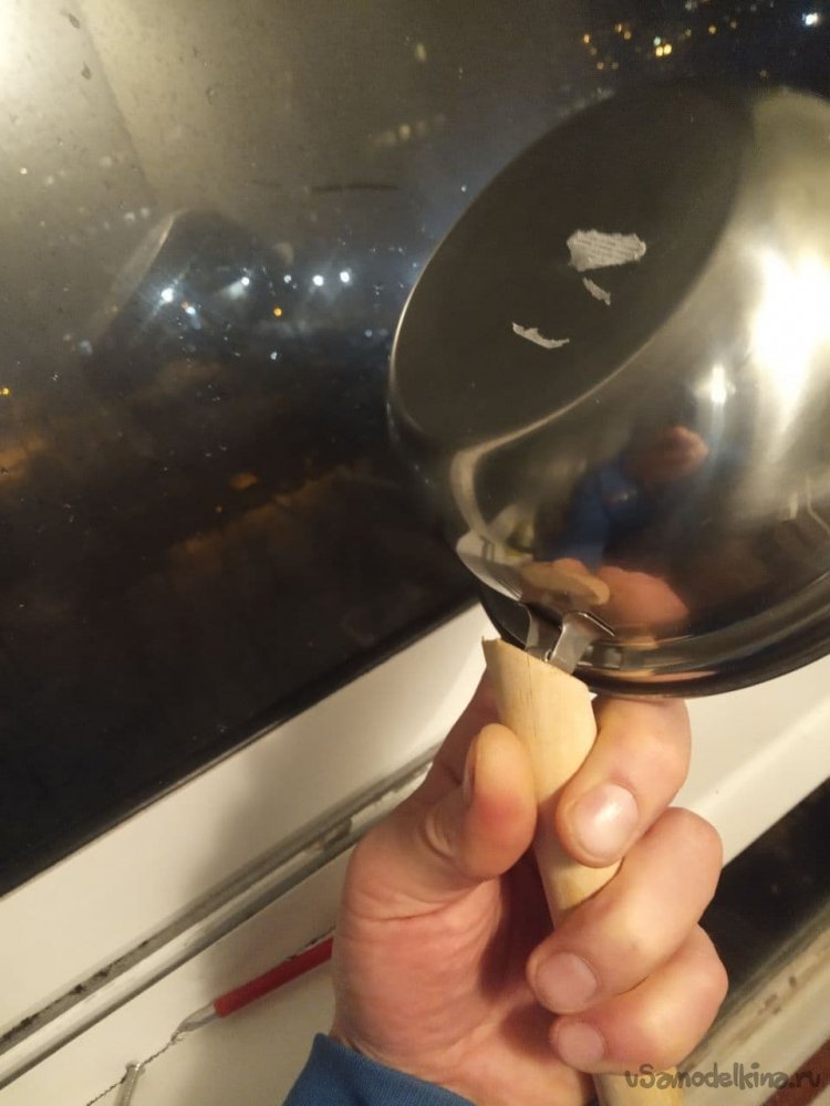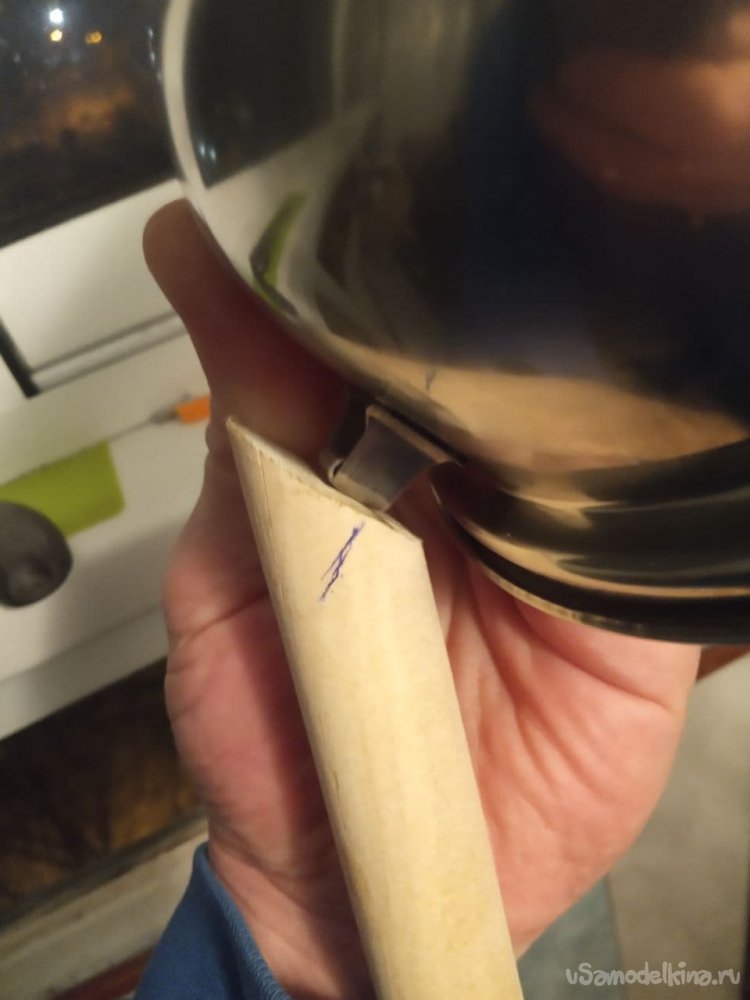 8. На укреплённый торчащий конец винта накручиваем сам ковшик. Непросто, но при старании не с первого раза, но получается. Готово. Изделие сделано, отдано на первоначальное тестирование моей семье. Всем понравилось, и мне тоже. Выглядит немного странно, но на вид добротно и крепко. Ничего отпиливать не буду, при случае на даче в бане испытаю, и при необходимости отпилю ровно столько, сколько будет нужно. На первый взгляд, такая длина в самый раз!