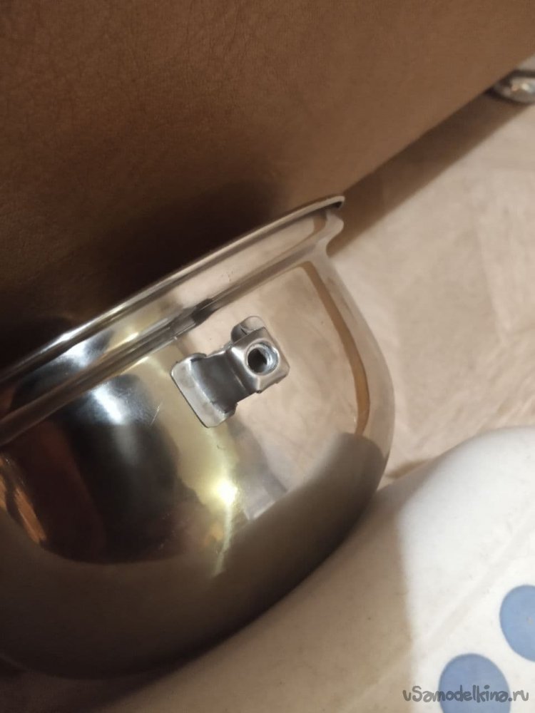 2. Изобретаем способ крепления черенка к ковшику. Самый сложный момент самоделки. Я объявил на изобретение этих способов два конкурса, на работе и дома. Победила моя идея. Если кто-то вдруг внимательно посмотрит на фотографию крепления пластмассовой ручки к покупному ковшику, там ситуация такая: скоба приварена к ковшику, в скобе зажата квадратная гайка. В ручке ковшика отверстие, и винт оттуда, из ковшика, вкручивается в гайку, укреплённую в скобе на ковшике. Мои мысли тут разбежались, то ли сделать новую ручку как продолжение старой, в одной с ней плоскостью, то ли изменить плоскость крепления. Я выбрал второе.
