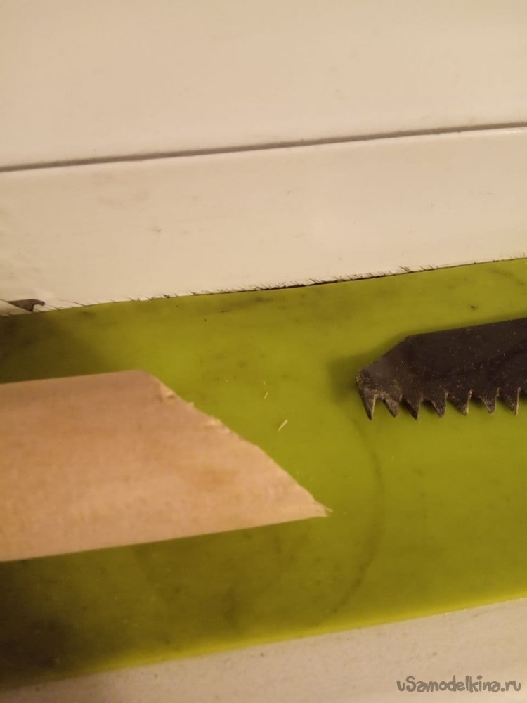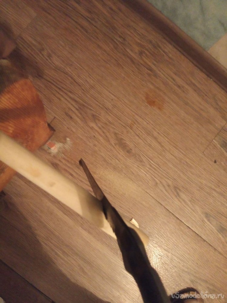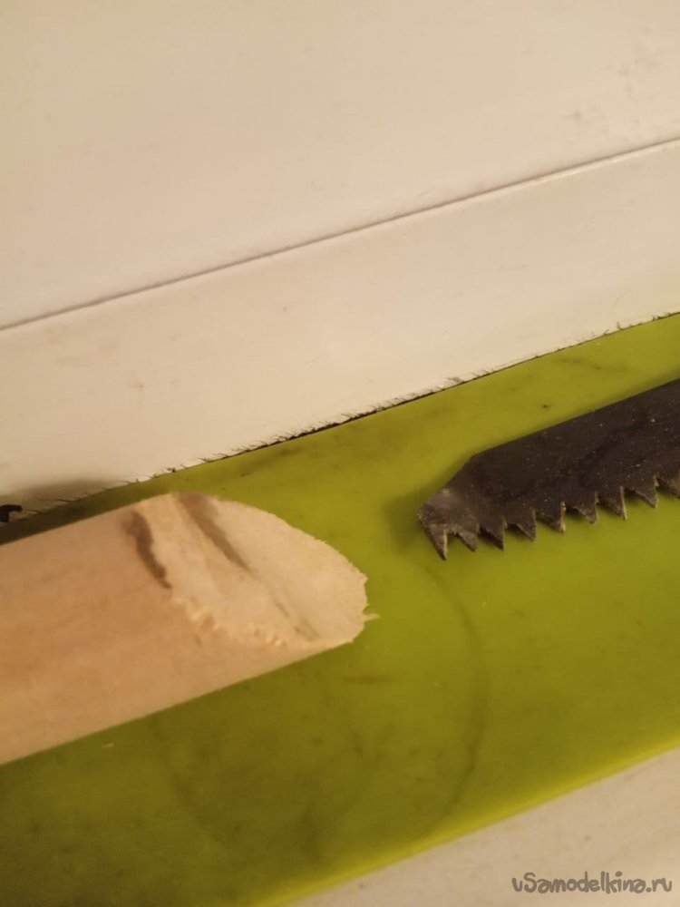 3. Спиливаем ножовкой по дереву черенок под 45 градусов. По уму надо бы было взять стусло, но оно потерялось, поэтому отпиливаем на глазок. Примеряем одно к другому, ручкой рисуем на черенке воображаемую линию прохождения ТО (технологического отверстия) через черенок.