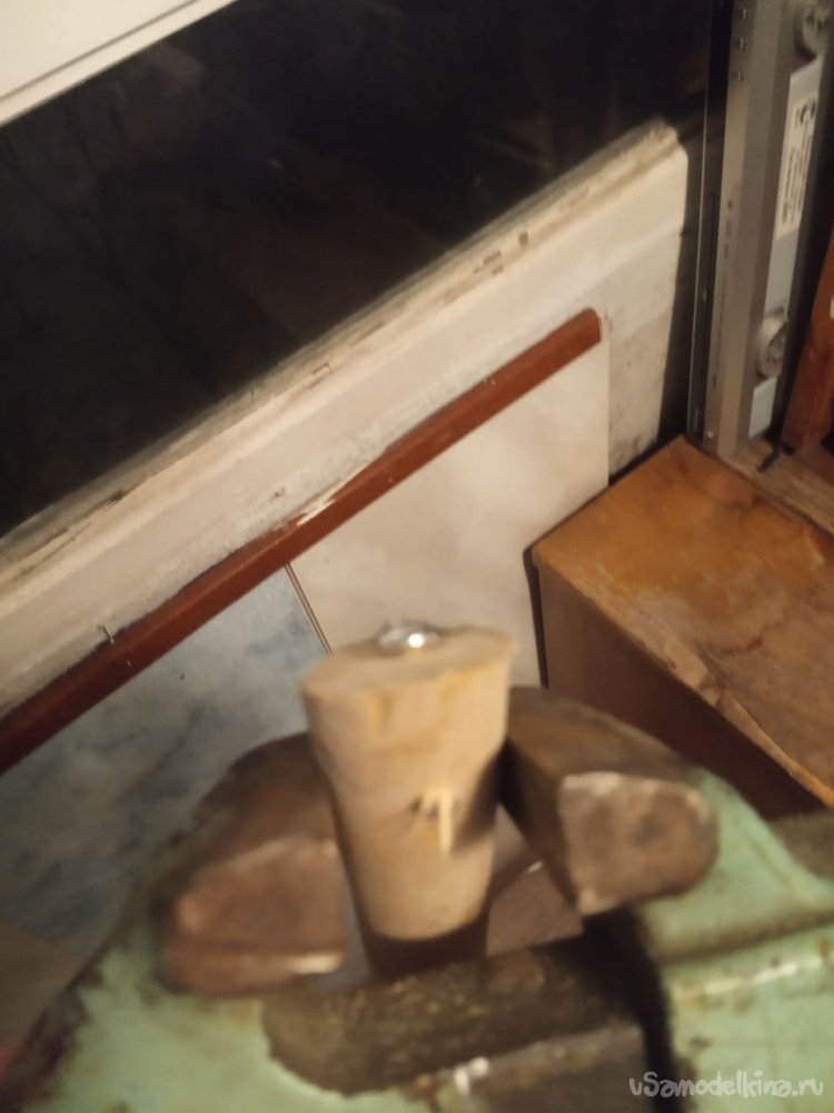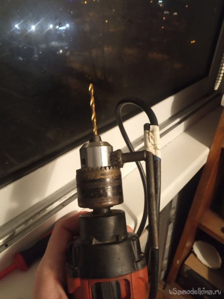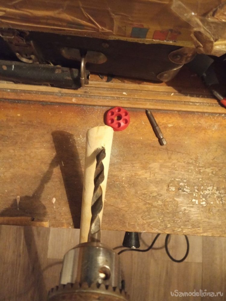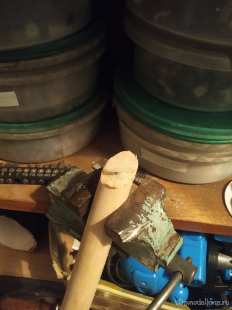 4. Отмечаем центр ТО на плоскости спиленной части. Укрепляем черенок в тисках, снаряжаем дрель. Мне захотелось отсверлиться сверлом, диаметров равным винту, чтобы он не болтался в дереве, а нарезал бы там резьбу сам себе. Калибр мне неизвестен, примерял на глазок.