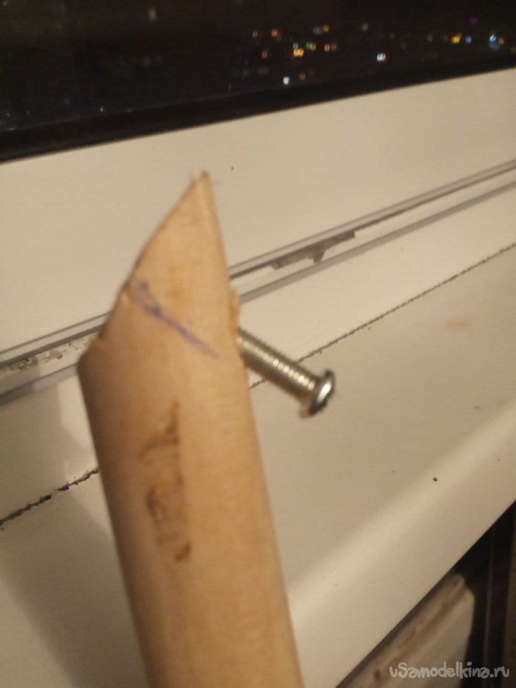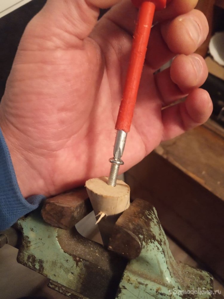 7. Вкручиваем винт в дерево до упора. В нужном месте показалось миллиметра 3-4 винта, поэтому меняем тактику.