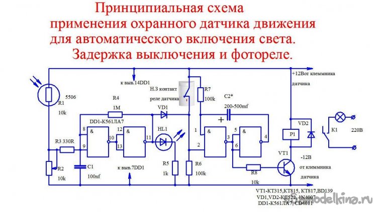 Учитывая вышесказанное было решено собрать самую простейшую схему для датчика движения. Она представляет собой фотореле и реле задержки. Данная схема состоит из дешевых широко распространенных радиодеталей, проста в изготовлении даже начинающим.