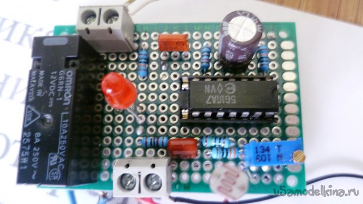 Схема работает так –фотореле в зависимости от освещенности (режим ДЕНЬ) блокирует работу задержки выключения света. Светодиод служит для индикации режима работы-день\ночь при настройке порога срабатывания фотореле. Диод VD1защищает от обратного напряжения с контактов датчика. Подстроечный резистор предназначен для настройки делителя напряжения R2, R1,подключенного ко входу 8,9 микросхемы К561ЛА7.