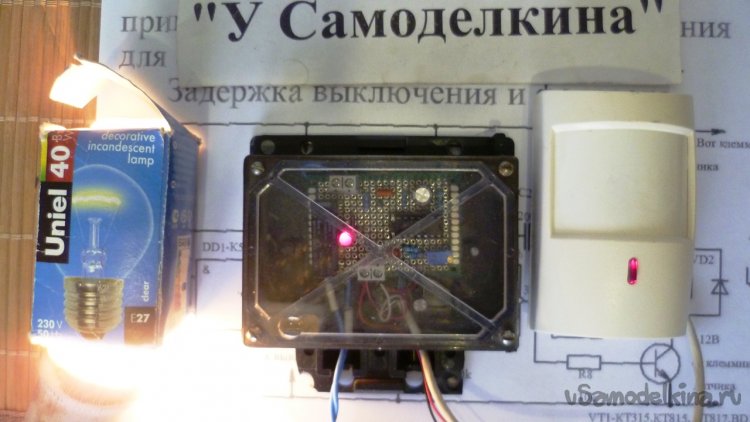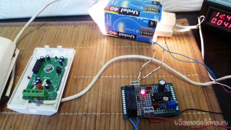 Устройство питается постоянным напряжением 12-15 В от датчика движения. Реле схемы выдерживает нагрузку до 8 А. Эту самоделку можно применить как для управления освещением, так для включения вентиляции и так далее.