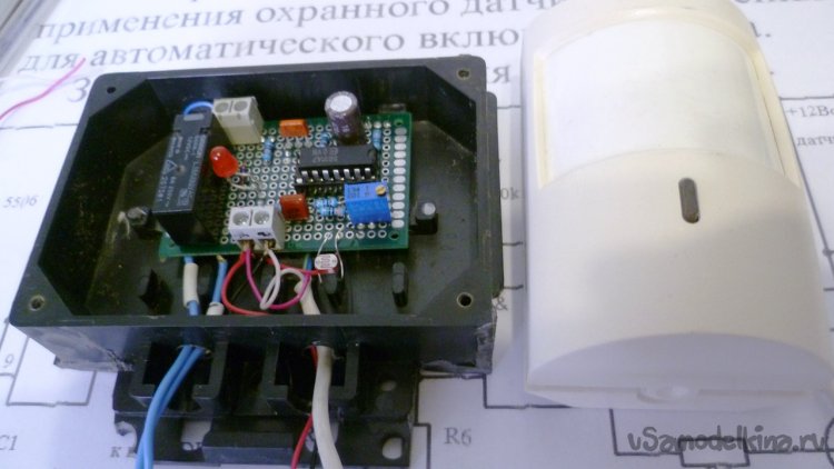 Напрямую подключить такой датчик не выйдет-контакты реле в дежурном режиме замкнуты (да и сами контакты его реле слабоваты-до 50мА). Длительность работы реле в режиме тревоги составляет 3 секунды-маловато. В датчиках освещения есть сумеречное реле. Которое днём не даёт включать нагрузку. Порог регулируемый. В датчике сигнализации его нет - надо и его собирать.