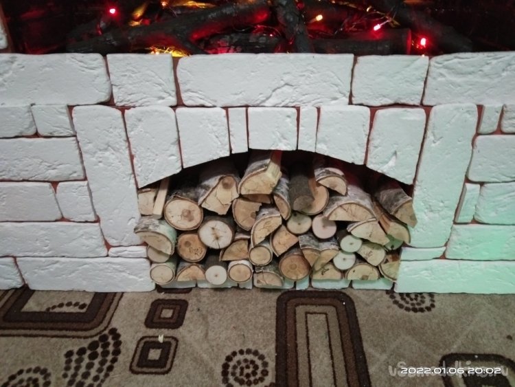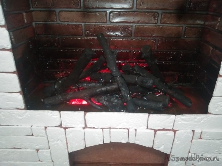 Для имитации искр на дровах я использовал гирлянду с несколькими режимами мерцания. Ею я обмотал поленья. Черной краской из баллончика немного окрасил внутреннее убранство камина, тем самым придав эффект закопченности пространства камина дымом.