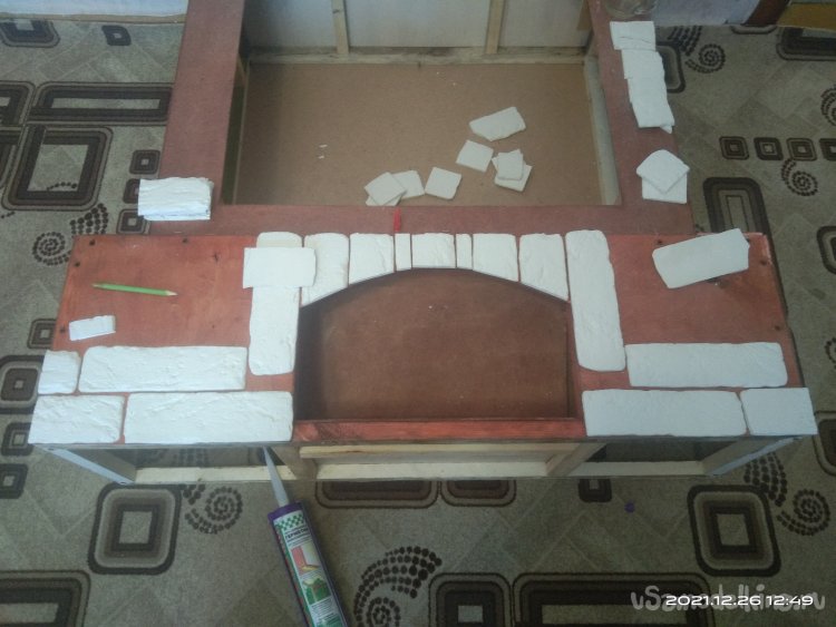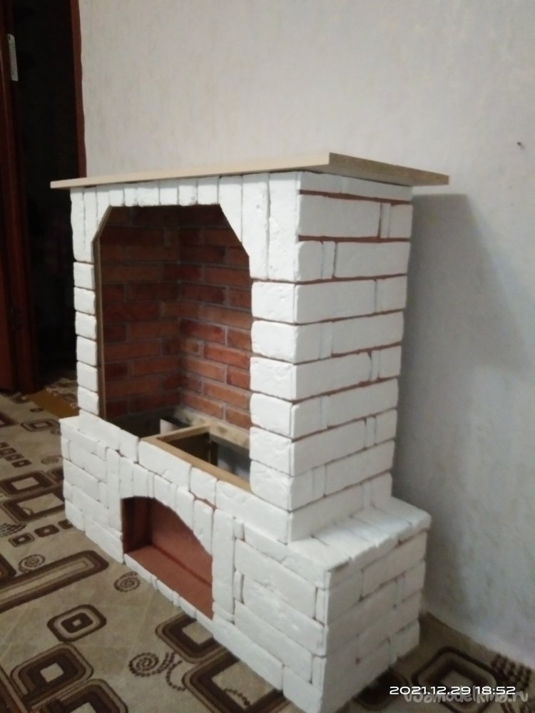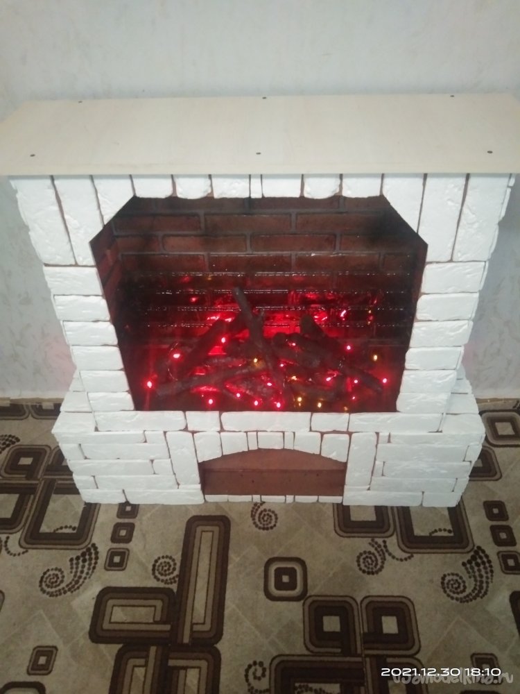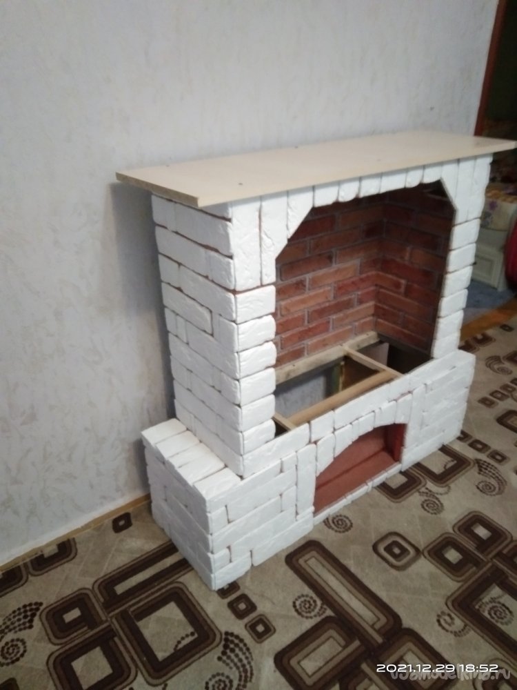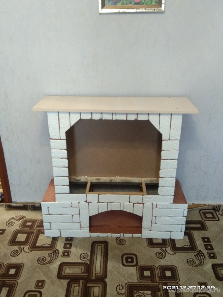 На крышку камина установил еще один ярус, сделав его немного выше и привлекательнее. Торцы крышек оклеил декоративной кромочной лентой, а сами крышки - клеющейся пленкой. И вот что вышло в конечном итоге: