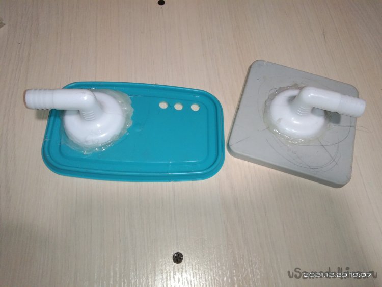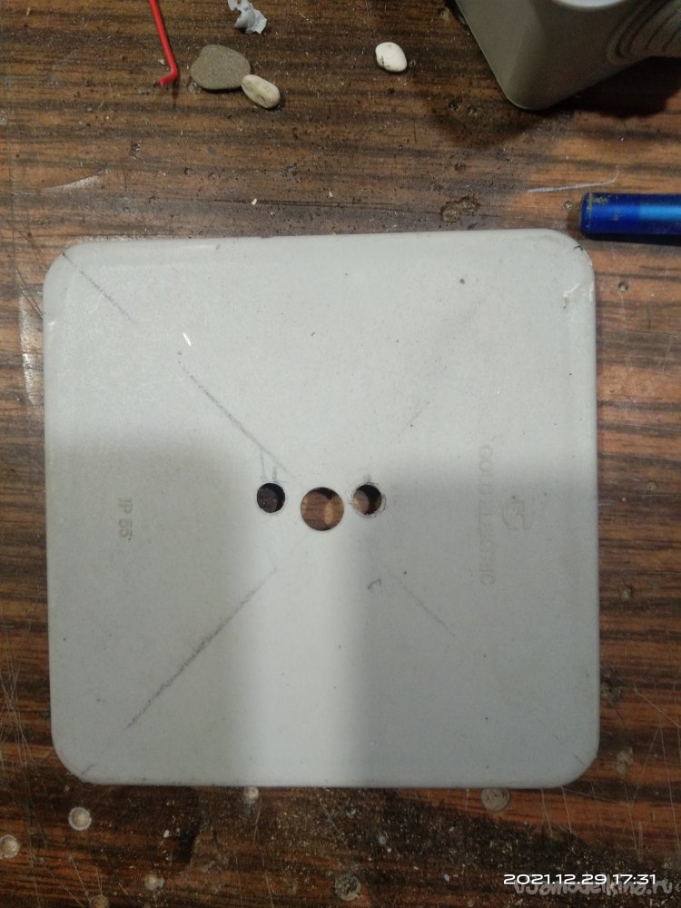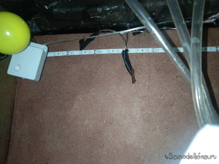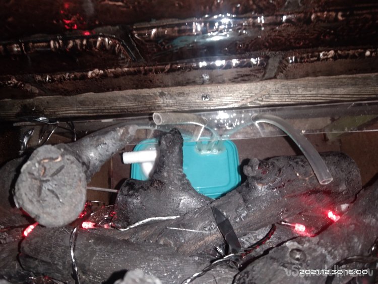 В крышке пластикового контейнера было проделано отверстие под соединительный уголок, а так же три отдельных отверстия под отрезки силиконового шланга. Соединительный уголок я взял с коробки в которой продаются интернет кабеля. Через него происходит вытягивание кабеля наружу. Очень удобная вещь, т.к. в нем есть специальные защелки, а так же юбка, которая опоясывает уголок. Вставив его в отверстие, проклеил вокруг юбки термоклеем для большей герметичности. В другие вставил силиконовые шланги и так же загерметизировал клеем. Второй соединительный уголок я установил на крышку распределительной коробки. В саму коробку я установил кулер, а провода вывел через резиновые уплотнители наружу для дальнейшего их расключения. В технологической нише расположенной по центру, прямо под кострищем, установил два патрона для ламп, по одной из каждой стороны. В них вкрутил лампы желтого цвета. Там же наклеил светодиодную ленту красного цвета. В итоге получилось две электрических линии - одна на 220V, а другая на 12V. Чтобы все это включалось провел в другую нишу переноску. Система дымогенерации должна была работать следующим образом: В пластиковый контейнер наливается вода, туда же опускается ультразвуковой парогенератор. Крышка контейнера плотно закрывается. Силиконовые шланги выводятся в отверстия которые есть на полке кострища. Далее гофрированным шлангом соединяем оба уголка, расположенных на крышках контейнера с водой и распределительной коробки. Запускаем парогенератор. Когда набирается достаточно пара подключаем кулер. Он нагнетает воздух в контейнер с паром и тот его вытесняет по шлангам наверх, распыляя в виде облаков дыма. Включаем подсветку и в идеале она должна была подсветить пар, который имитировал бы языки пламени.