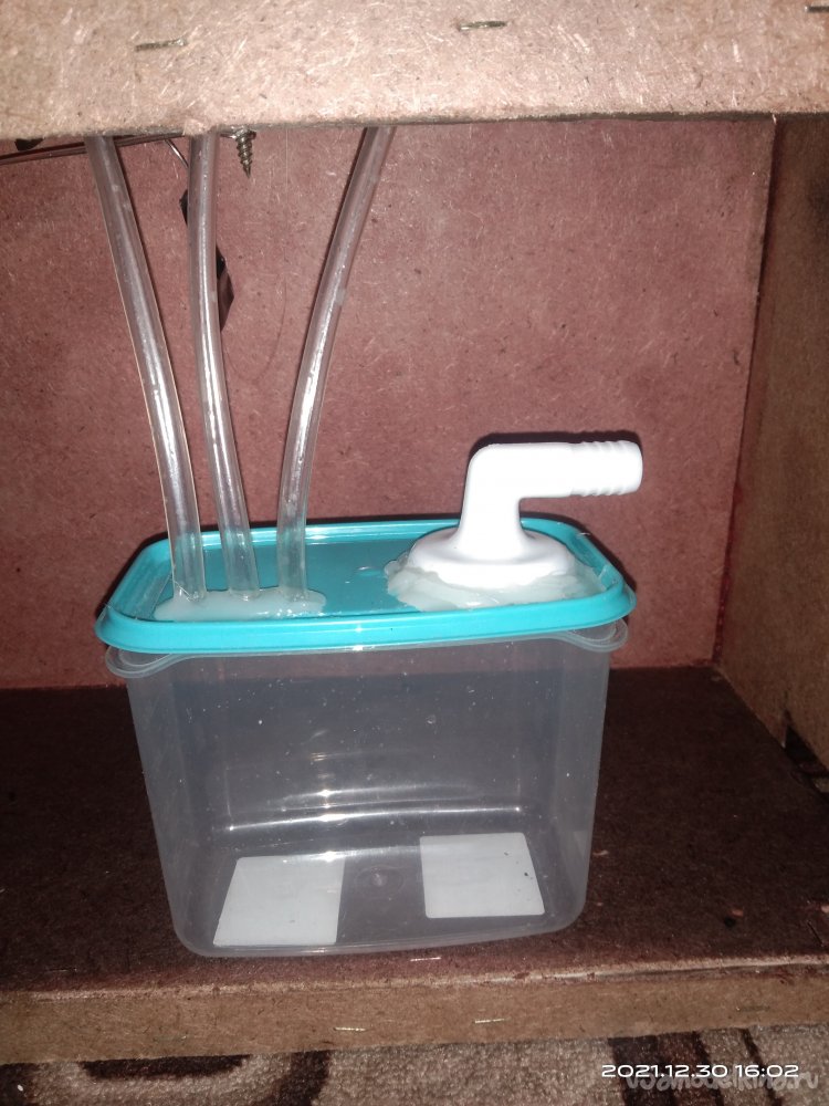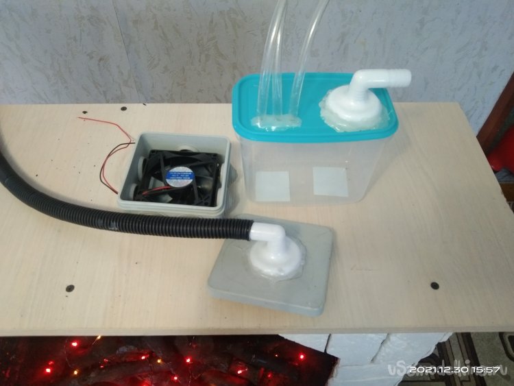 Для изготовления системы мною были дополнительно приобретены: пластиковый контейнер с крышкой, компьютерный кулер, распределительная электрическая коробка, метр силиконового шланга и кусок гофры.