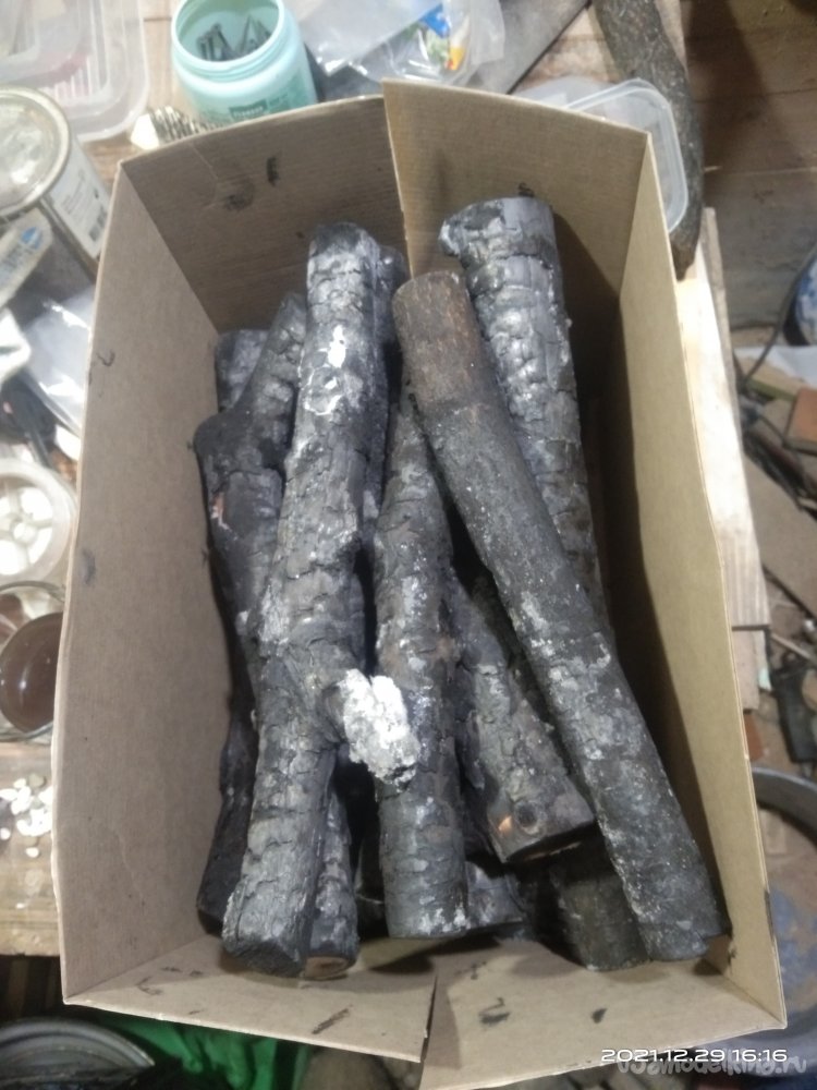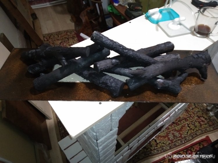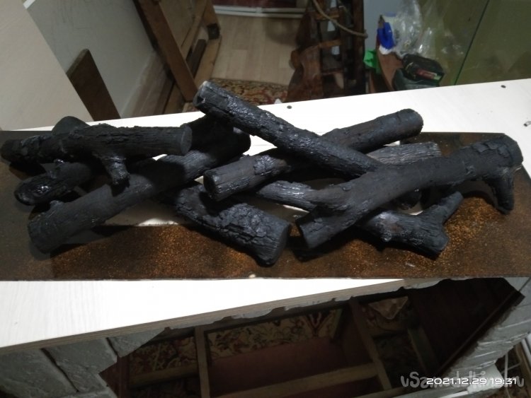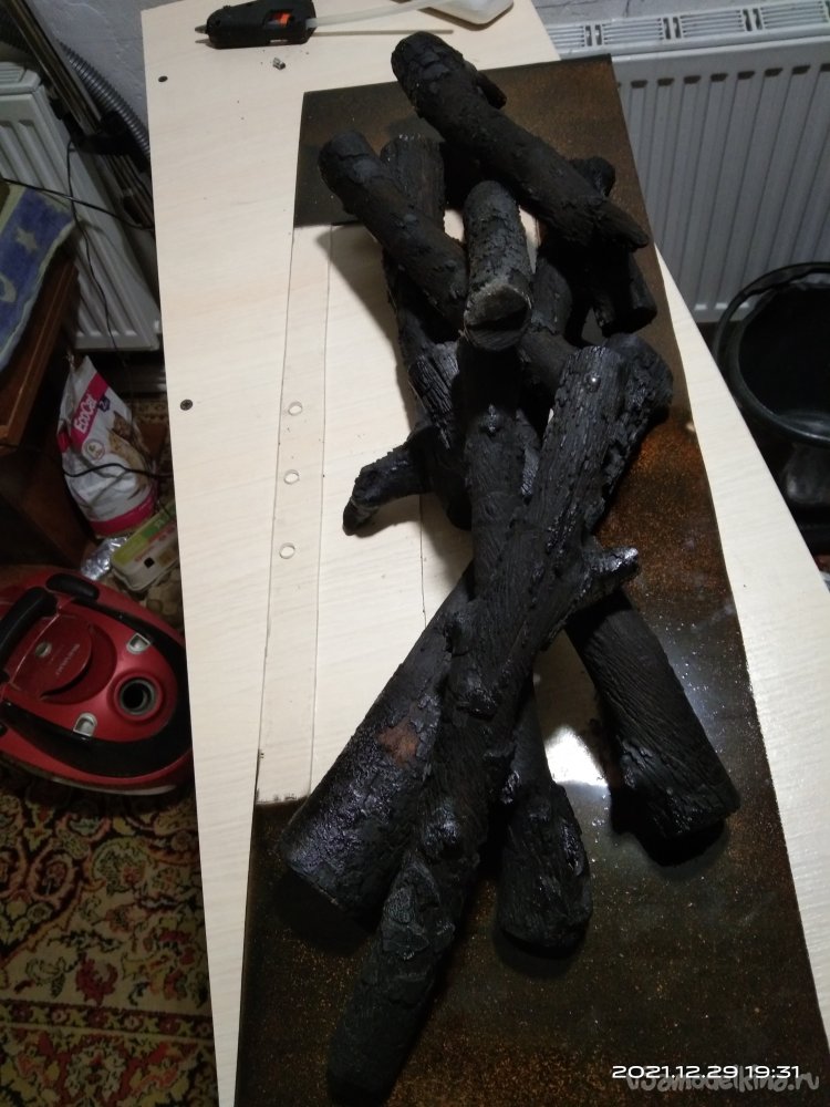 Чтобы сделать дрова внутри камина более реалистичными, я взял несколько березовых веток разной толщины и длины и хорошенько обжог их на костре. Положил их в огонь и дожидался того момента, пока они не начнут полностью сгорать. Затем вытащил их из пламени, потушил тлеющие искры и металлической щеткой убрал всю сгоревшую древесину. Но без фанатизма. Бесцветным лаком покрасил все поленья. Так они сохранят свой антрацитовый цвет, будут блестеть и не будут пачкать руки при их установке в камин. Поленья креплю к полке, которая будет устанавливаться внутри камина. Изначально пробовал для закрепления их на полке термоклеевой пистолет. Но, во-первых, это как оказалось очень ненадежно, а во-вторых места склеивания очень трудно скрыть, да и сама конструкция смотрится довольно убого и неряшливо. Поэтому использовал черные саморезы по дереву, которыми и стягивал дрова между собой и все конструкцию к полке. Получилось очень даже ничего, практически как настоящий костер, только без языков пламени.