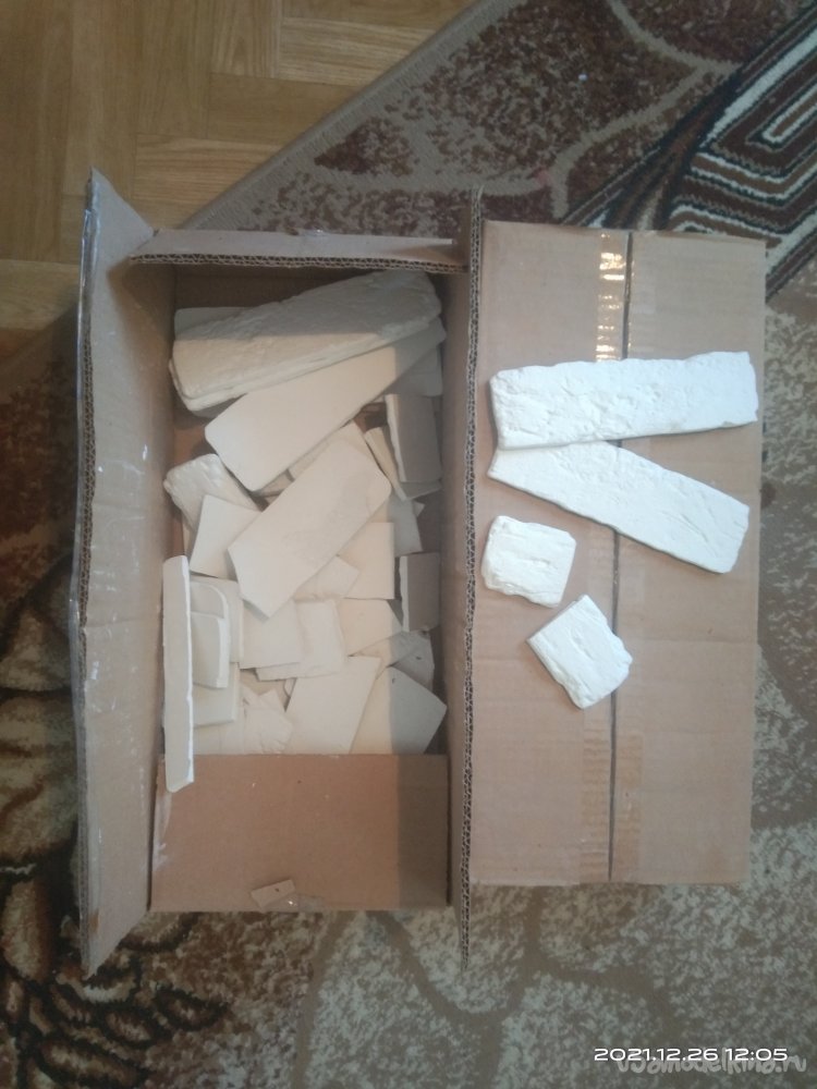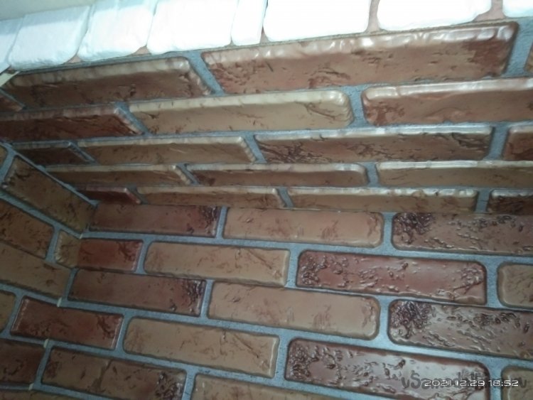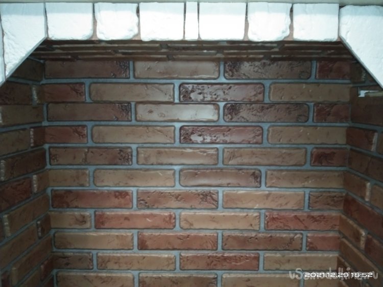 Далее необходимо придать камину внешний лоск, т.е. сделать его более естественным, настоящим. Для этой цели я решил использовать декоративный гипсовый кирпич. Его преимущество в том, что он достаточно легок, имеет интересную структуру и очень легко подвергается нужной обработке, резке. Клеил его к стенкам камина с помощью герметика. Между кирпичами оставлял довольно большие промежутки. Т.к. сам камин покрашен лаком, то эти промежутки между кирпичами смотрятся достаточно интересно. Для декорирования внутреннего пространства было куплено несколько кухонных фартуков, имитирующих кирпичную кладку. Обрезав их по нужным размерам, нанес герметик на места крепления к камину, приложил их. После того, как герметик зафиксировал панели на стенках, небольшими гвоздиками для большей надежности зафиксировал их.