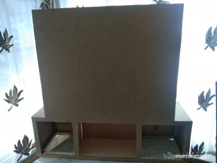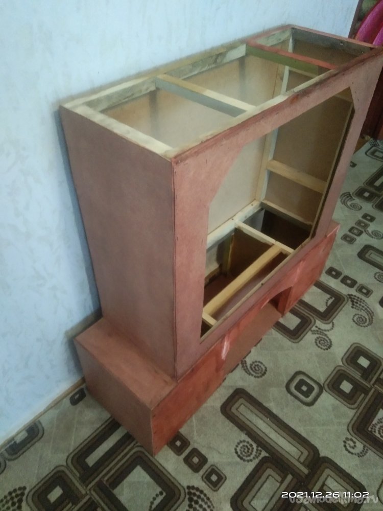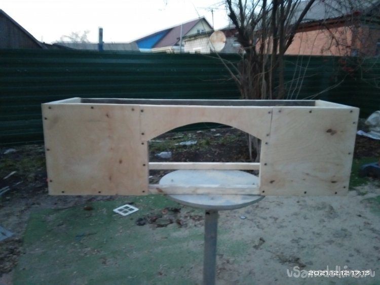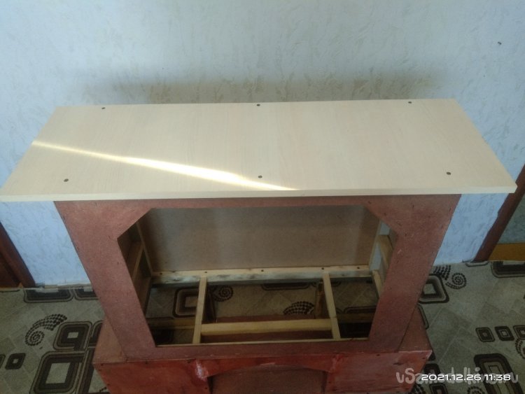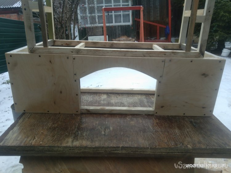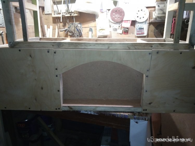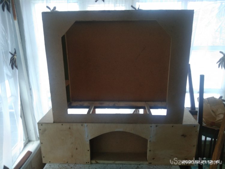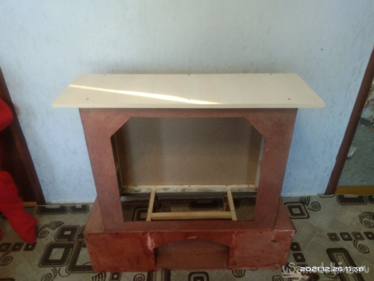 Когда с этой частью камина было закончено, начал обшивать переднюю часть. Для обшивки использовал фанеру в 4 мм. Вырезал полукруглую часть для портала и боковые стенки. Все это закрепил на основе саморезами. Затем закрепил верхнюю часть камина, квадратную, на нижнюю часть. Получилась готовая основа камина, уже вполне узнаваемая. В верхней части так же установил перемычки между стенками для удобного крепления обшивки и другие ребра жесткости. Так же с помощью брусков придал передней части вид полуарки, для обшивки. Из обрезка фанеры вырезал небольшую полочку во внутренней части камина. Она нужна для того, чтобы после того, как изделие будет готово и начнет работать, на нее можно было бы установить или положить какой-нибудь музыкальный гаджет, чтобы он проигрывал звуки костра, треск искр.